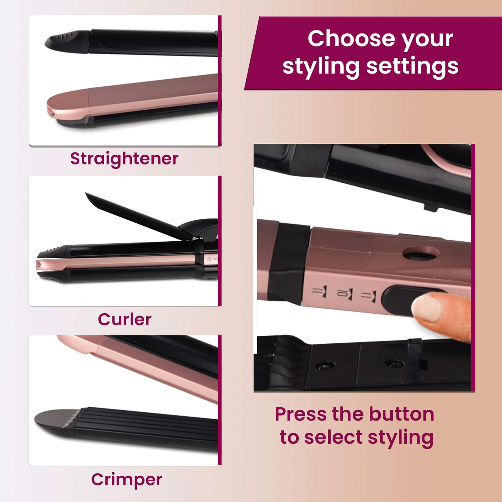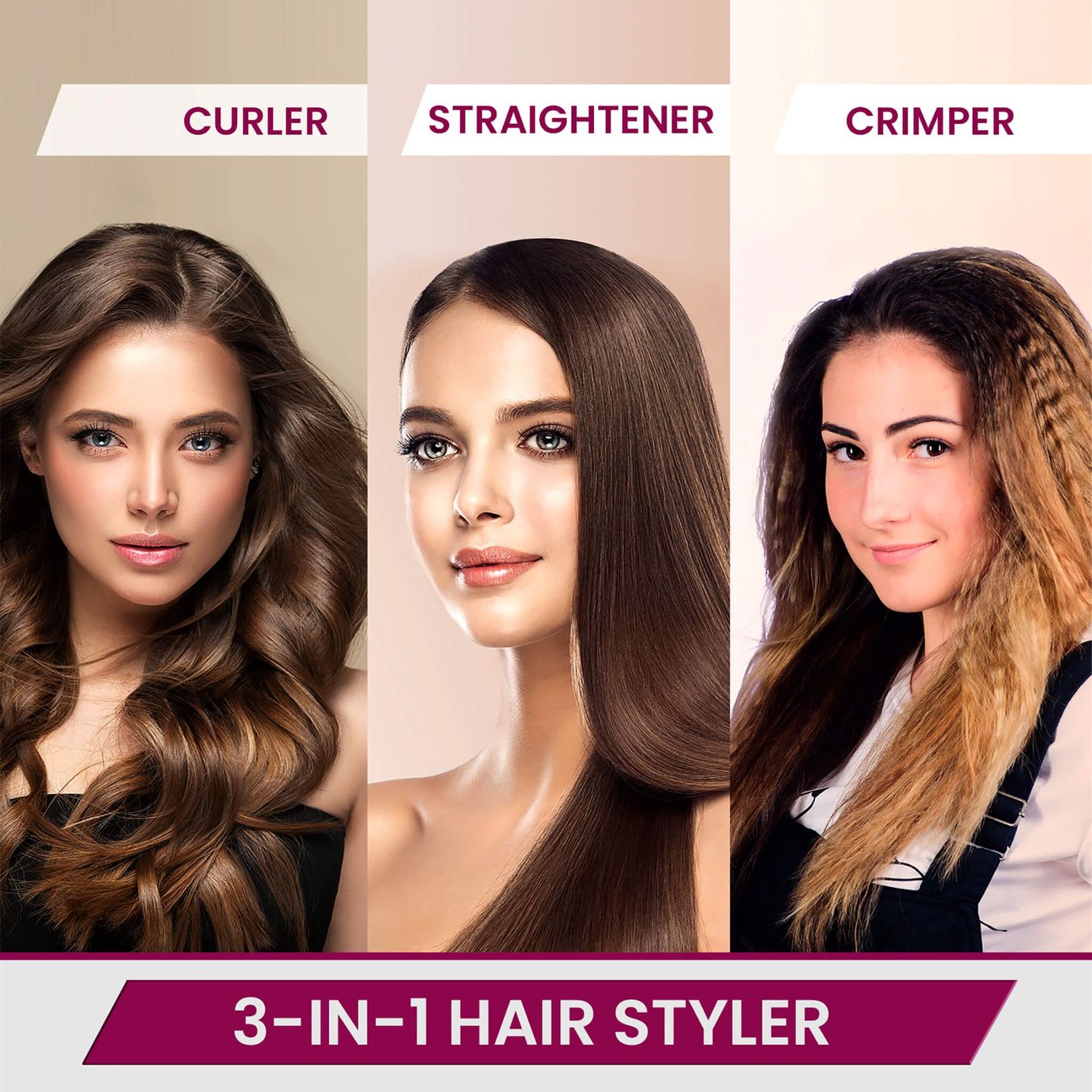 • 3 in 1 Hair styler- Straightener Plates, Crimper Plates, and Hair Curler