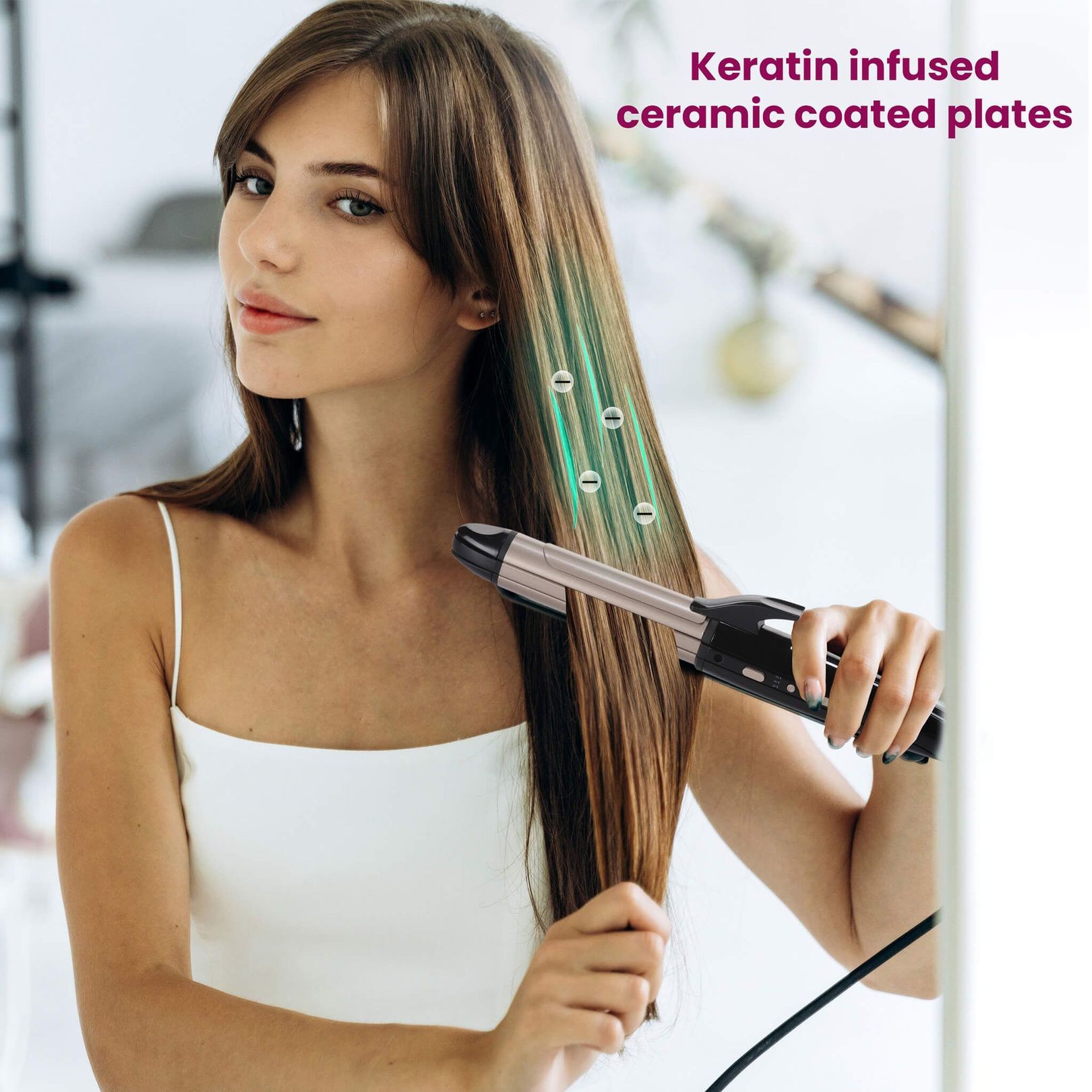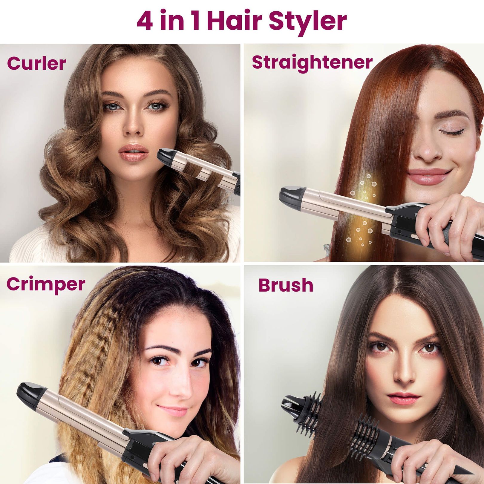 • 4 in 1 Hair styler- Straightener Plates, Crimper Plates, Hair Curler, and Brush