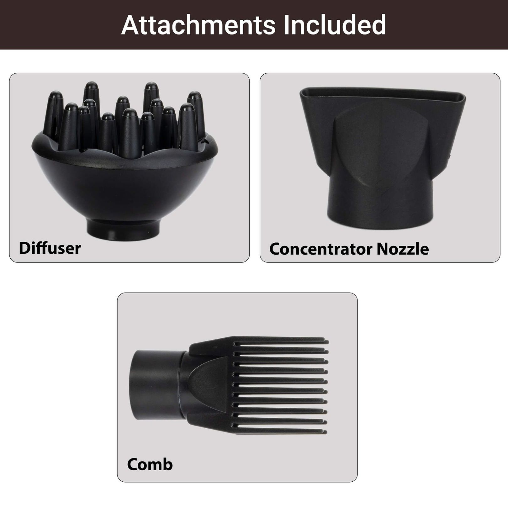 • Comes with Diffuser, Concentrator Nozzle, Comb and 2.5 meter Long Cord
