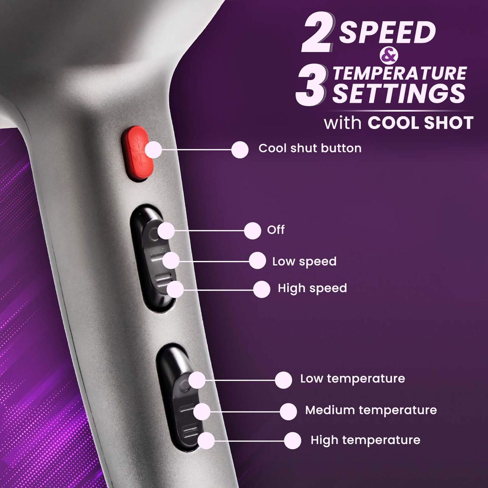 • 2 Speed and 3 Temperature settings for convenient styling, Includes Cool & Hot Air