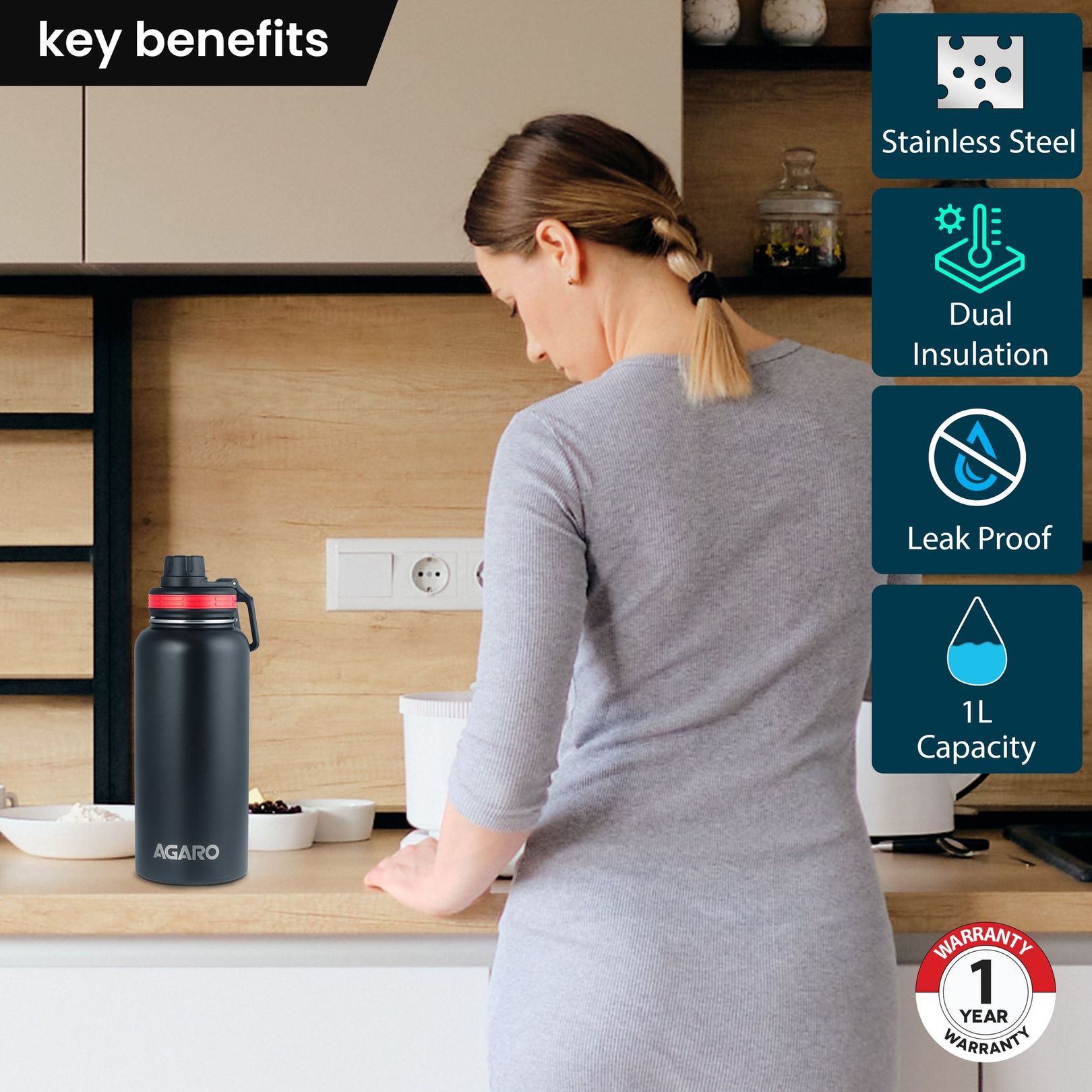 • 304 grade inner and outer stainless steel crafted 1L vacuum flask