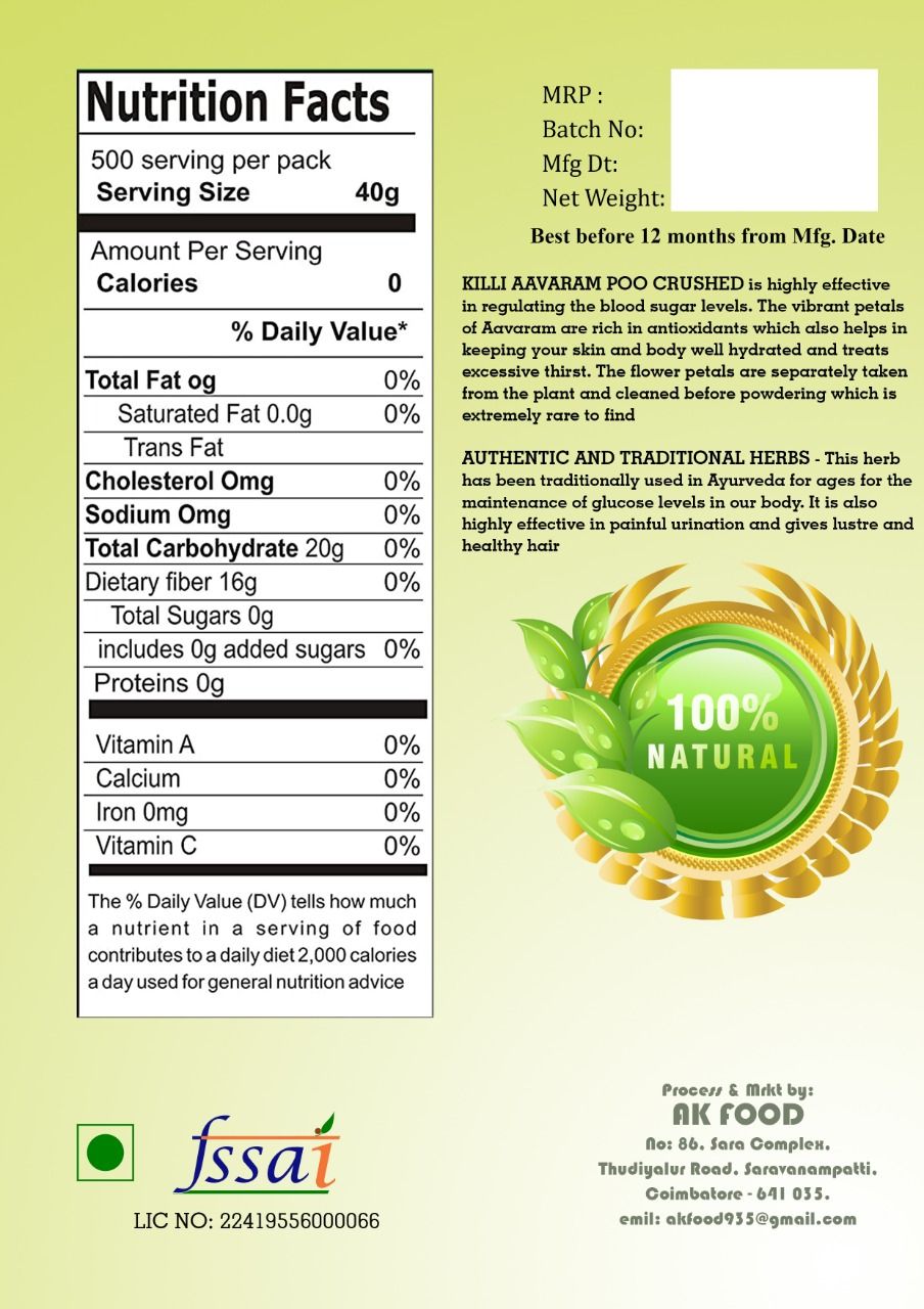 KILLI AAVARAM POO CRUSHED is highly effective in regulating the blood sugar levels. The vibrant petals of Aavaram are rich in antioxidants which also helps in keeping your skin and body well hydrated and treats excessive thirst. The flower petals are separately taken from the plant and cleaned before powdering which is extremely rare to find
