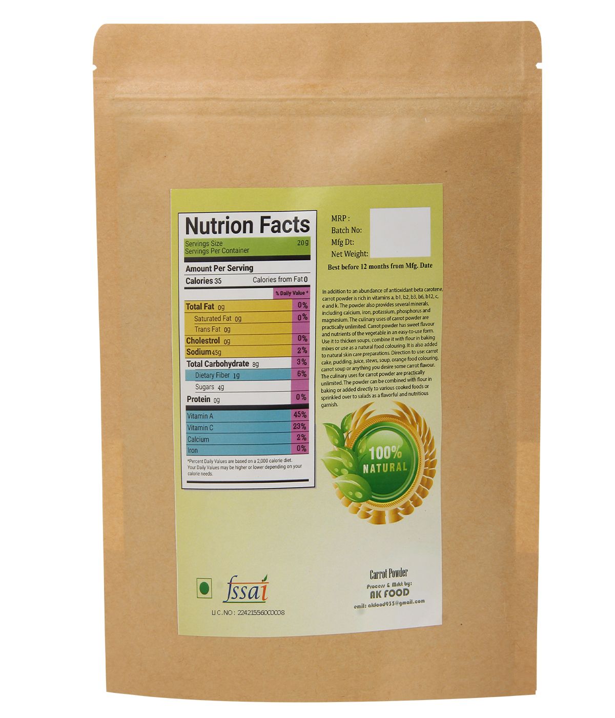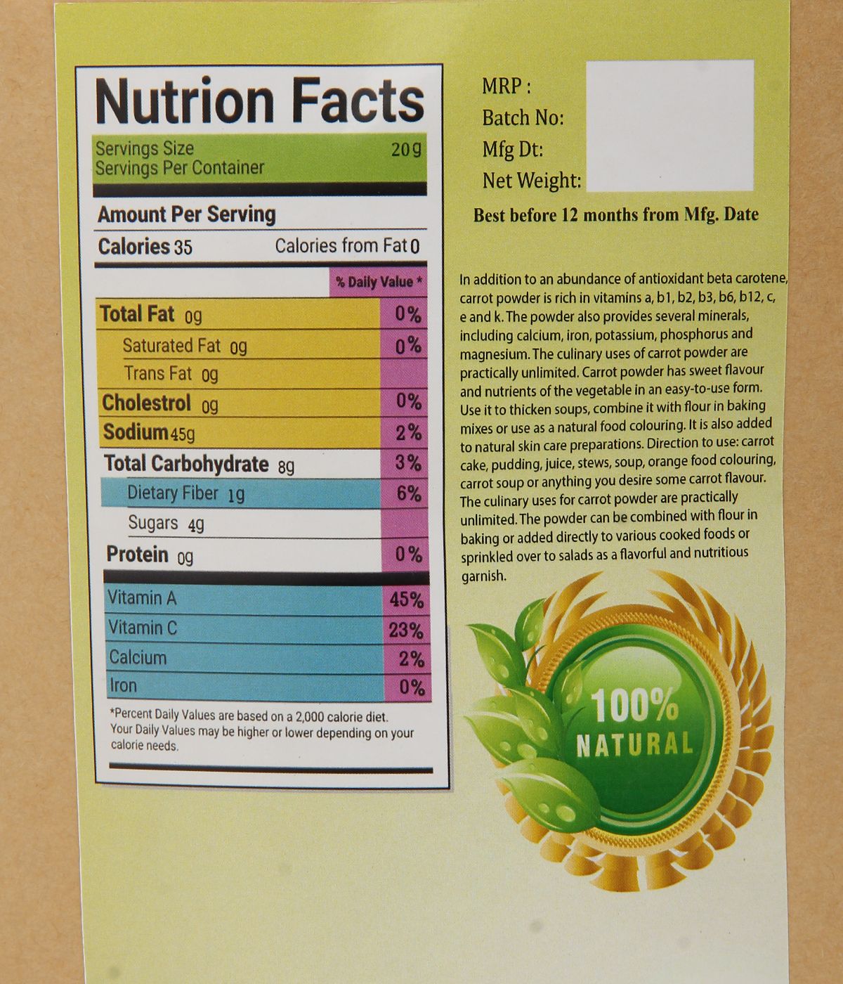 In addition to an abundance of antioxidant beta carotene, carrot powder is rich in vitamins a, bl, b2, b3, b6, b12, c, e and k.