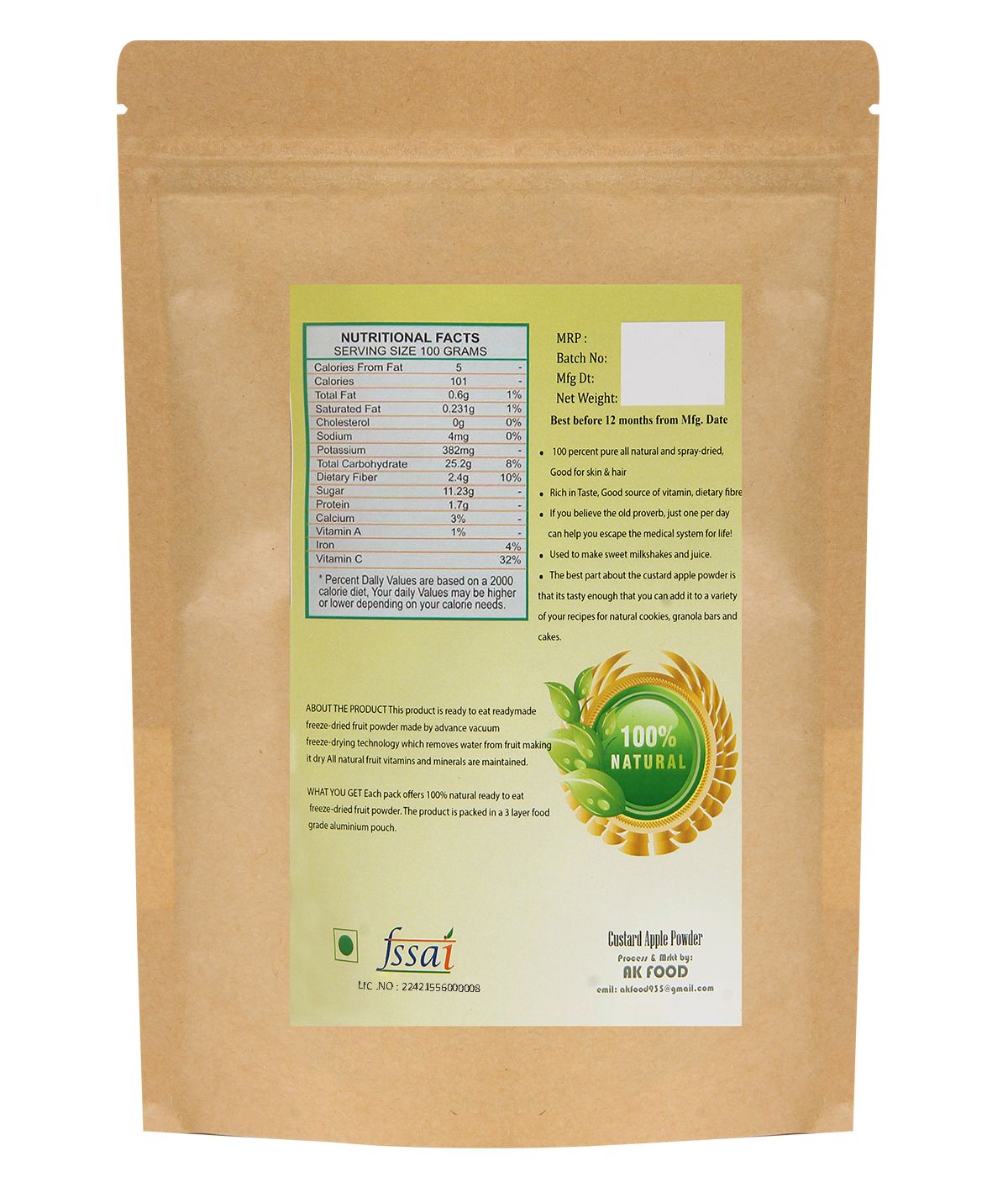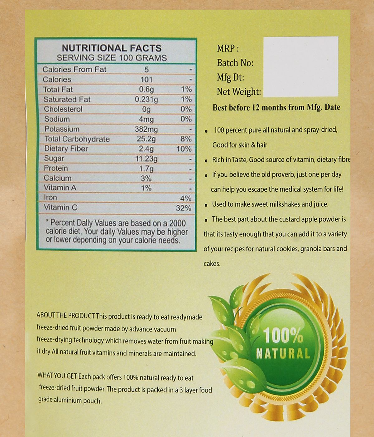 This product is ready to eat readymade freeze-dried fruit powder made by advance vacuum freeze-drying technology which removes water from fruit making it dry All natural fruit vitamins and minerals are maintained.