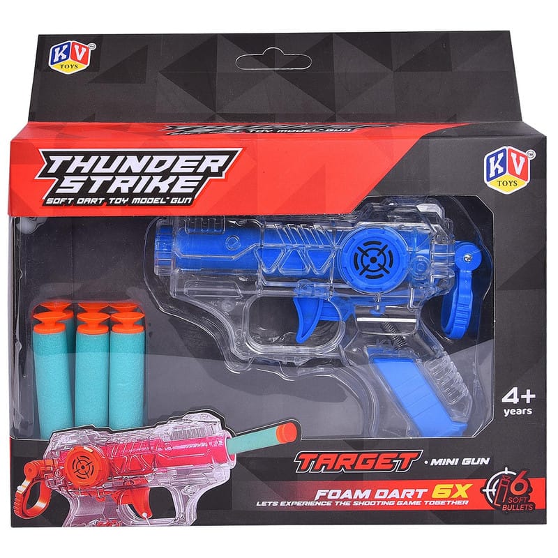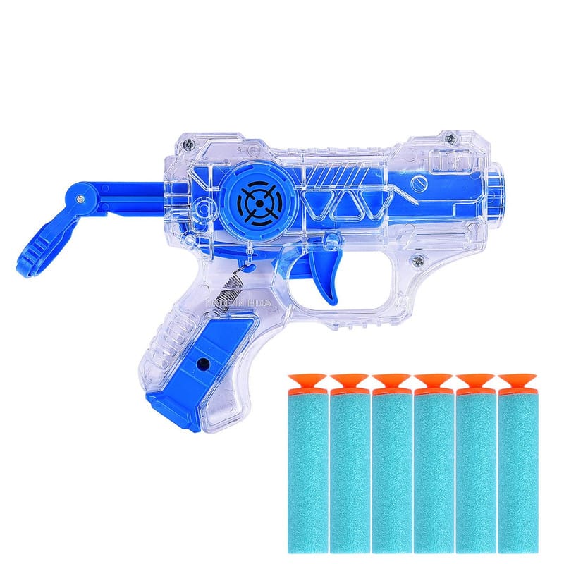 Experience action-packed fun with the Transparent Thunder Strike 6 Foam Dart Gun Toy! This high-quality dart gun is designed with a sleek, transparent body and features a smooth reloading mechanism for exciting and safe play. Perfect for kids and adults alike, it's an ideal choice for indoor and outdoor activities.
