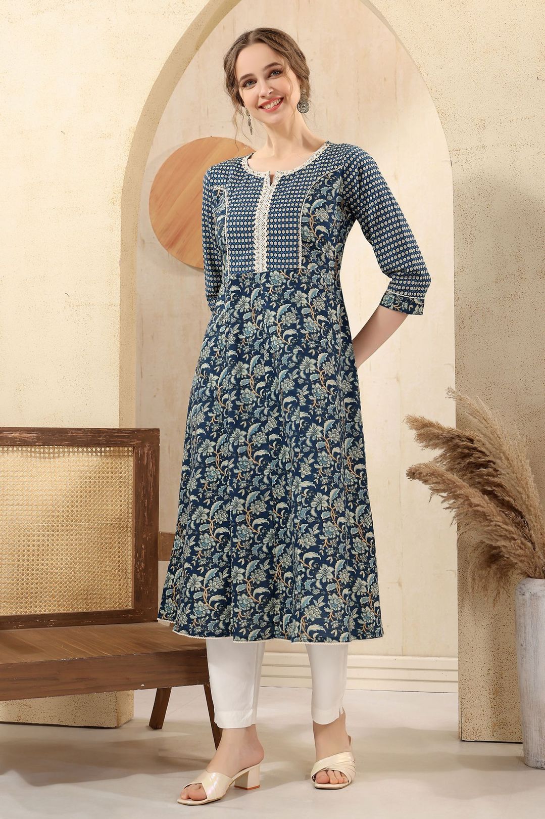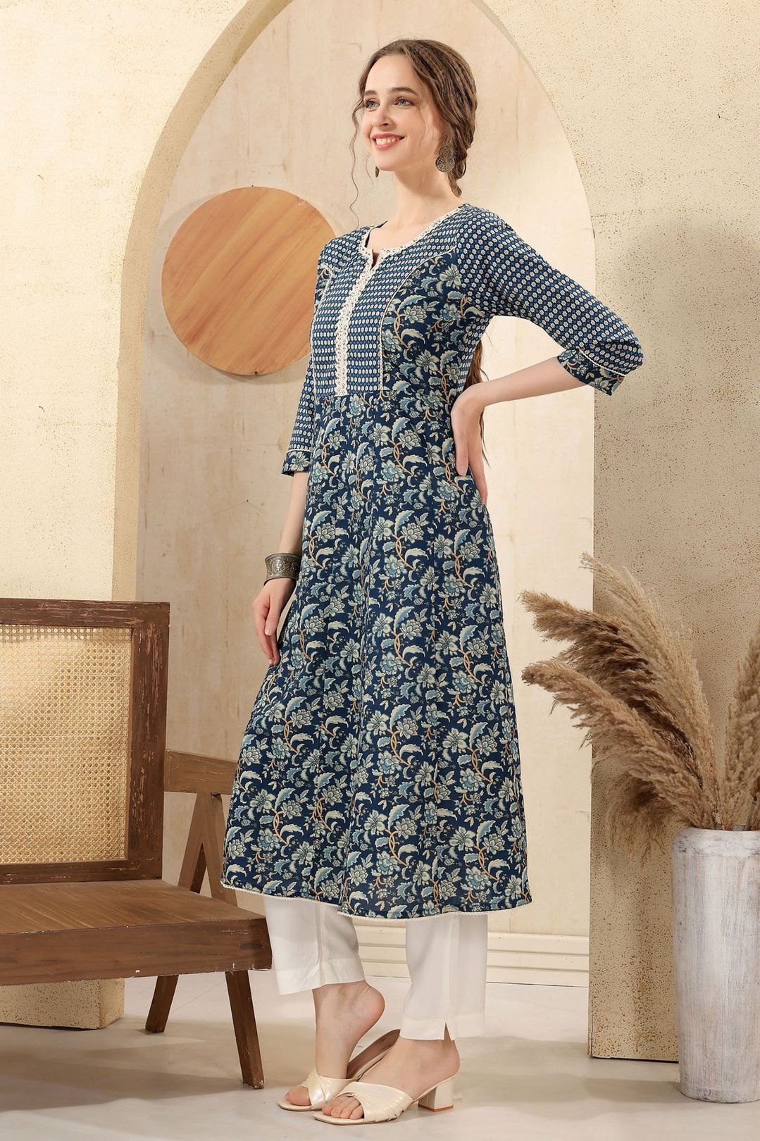 Blue Jaipuri Cotton Print Anarkali For Women With Laces Embellishment. Round Neck, Princess Cut and Beautiful Mix-n-Match print makes it exclusive and party wear.