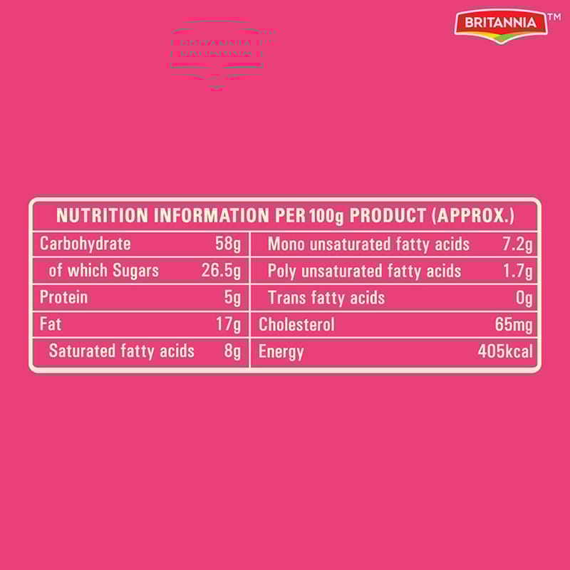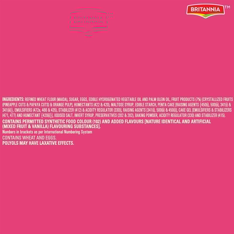 Wheat Flour, Sugar, Edible Vegetable Oil, Fruit Bits, Eggs, Milk Solids, Raising Agents, and Natural & Artificial Flavours.