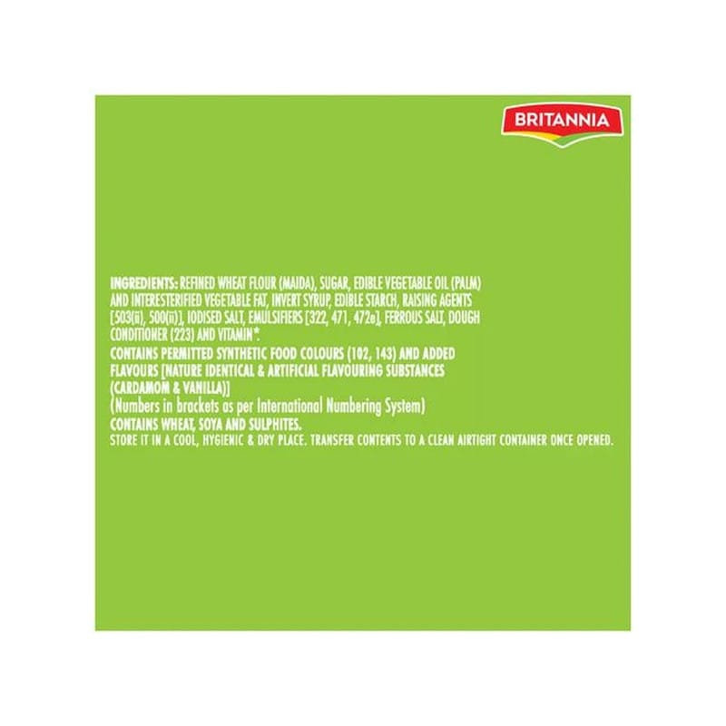 Refined Wheat Flour (Maida), Sugar, Edible Vegetable Oil, Cardamom Flavour, Milk Solids, Leavening Agents (INS 500(ii), INS 503(ii)), Emulsifiers, and Permitted Food Colours & Flavours.