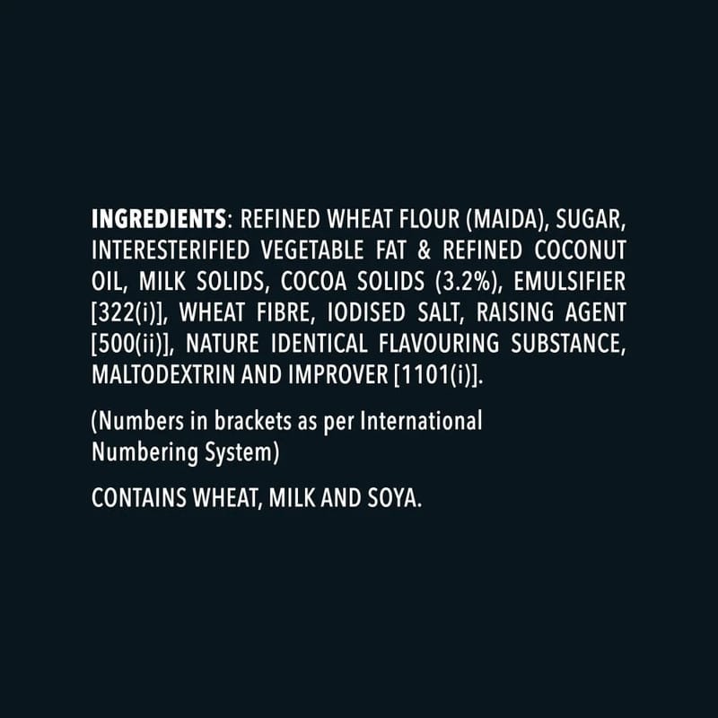 Wheat Flour, Sugar, Vegetable Oil, Cocoa Powder, Chocolate Flavour, Raising Agents (INS 503(ii), INS 500(ii)), and other permitted additives.