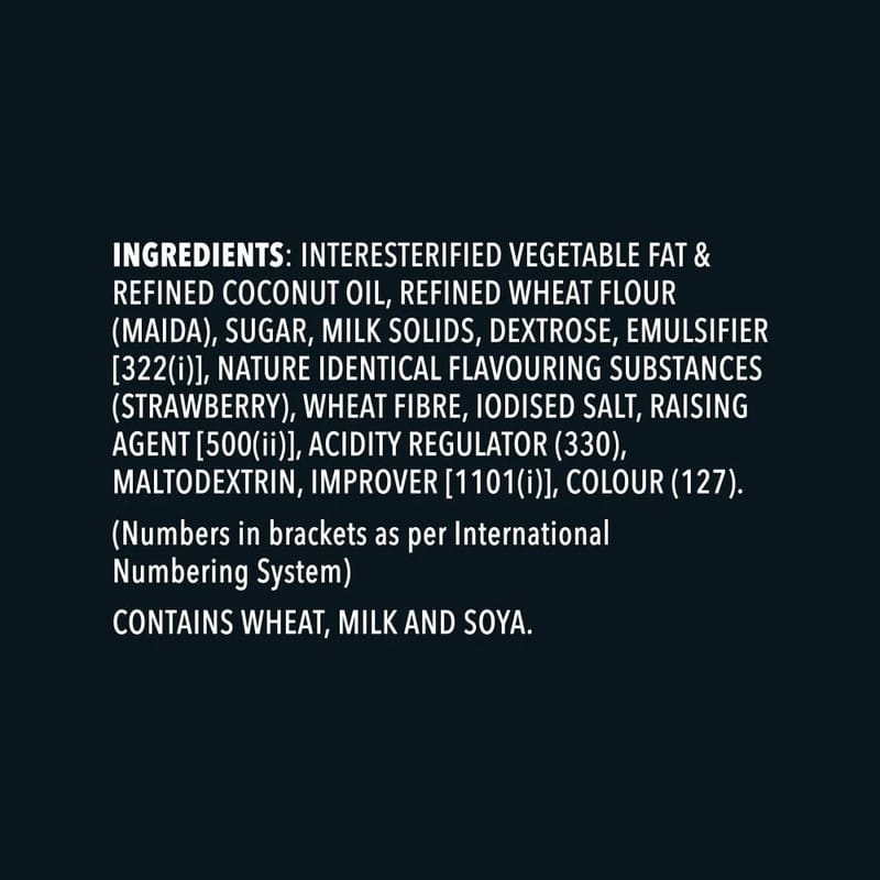Wheat Flour, Sugar, Palm Oil, Strawberry Flavored Cream (Sugar, Vegetable Oil, Milk Solids, Strawberry Flavour, Emulsifiers), Raising Agents (INS 500(ii), INS 503(ii)), Salt, and other permitted additives.