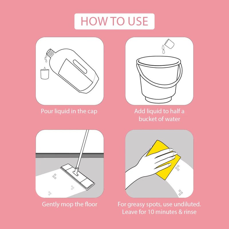 Mix 1 capful (approx. 10ml) of the cleaner in 1 liter of water and use it to mop floors or clean surfaces.