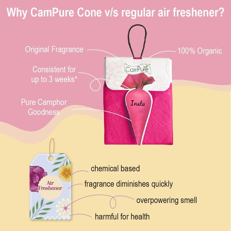 Experience the refreshing aroma of CamPure Insta Cone - Rose, a premium air freshener designed to keep your surroundings fragrant and fresh. Made from 100% organic camphor, this compact air freshener is perfect for a variety of spaces.