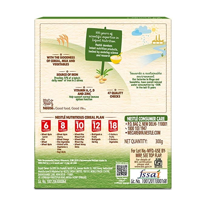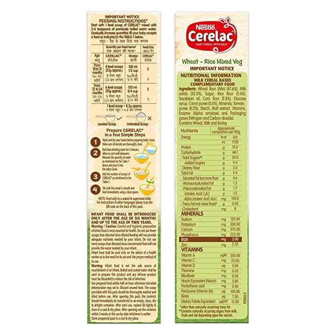 Nestl CERELAC Baby Cereal with Milk, Wheat - Rice Mixed Veg is a complementary food for babies from 10 to 24 months. While infants and children have higher requirements of nutrients than adults, 2 serves of CERELAC Wheat - Rice Mixed Veg Cereal provides 37% of a baby s daily need of iron. It is also a source of 14 important nutrients including vitamins and minerals. Nestl develops infant nutrition products backed by evolving science and research. Innovation has been at the heart of Nestl since its beginning. Optimal Preparation: Careful and hygienic preparation of Infant food is most essential for health. Do not use fewer scoops than directed, since diluted feeding will not provide adequate nutrients needed by your infant. Do not use more scoops than directed since concentrated feed will not provide the water needed by your infant. Wash and dry your hands before preparing baby s food. Make sure all utensils are thoroughly clean. Boil clean drinking water for 5 minutes. Allow to cool until lukewarm. Measure the quantity of water as mentioned on the table-1 above and pour it into the baby s bowl. Add the number of scoops of CERELAC as mentioned in the table 1. Stir until the cereal is smooth and feed immediately using a clean spoon. Storage: