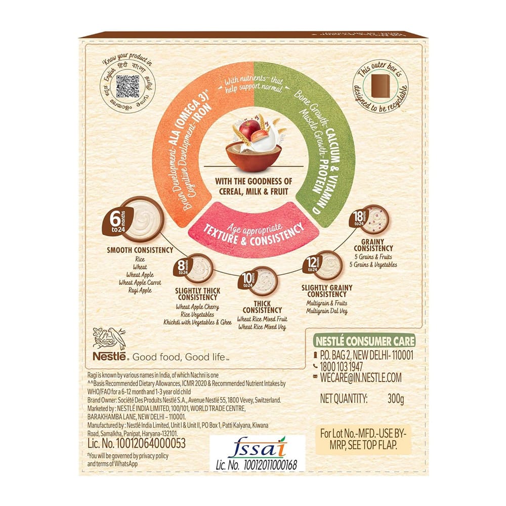 Nestl CERELAC Fortified Baby Cereal with Milk, Ragi Apple is a complementary food for babies from 8 months onwards. While infants and children have higher requirements of nutrients than adults, 2 serves (1 serve= 25g Cerelac Powder + 75ml Water) of CERELAC Ragi Apple Cereal provides 75% of a baby s daily need of iron. Also a source of 19 important nutrients including vitamins and minerals, CERELAC Ragi Apple Cereal is free from added colours, flavours and preservatives. Nestl develops infant nutrition products backed by evolving science and research. Innovation has been at the heart of Nestl since its beginning. Optimal Preparation: Careful and hygienic preparation of Infant food is most essential for health. Do not use fewer scoops than directed, since diluted feeding will not provide adequate nutrients needed by your infant. Do not use more scoops than directed since concentrated feed will not provide the water needed by your infant. Storage: After opening the pack, the contents should immediately be transferred to an empty, clean and dry airtight container. Replace the lid tightly after every use and store in a cool, dry place. Ensure enclosed scoop is thoroughly washed and dried before use. After opening, use the contents within 3 weeks or the expiry date, whichever is earlier. Important Notice: Mother s milk is best for your baby. Safety Warnings: Infant food shall be introduced only (after the age of 6 months up to the age of two years). Infant food should be used only on the advice of a health worker as to the need for its use and the proper method of its use. Infant food is not the sole source of nourishment for an infant. Use prepared feed within half an hour otherwise microbial deterioration may set in. Discard unused feed.