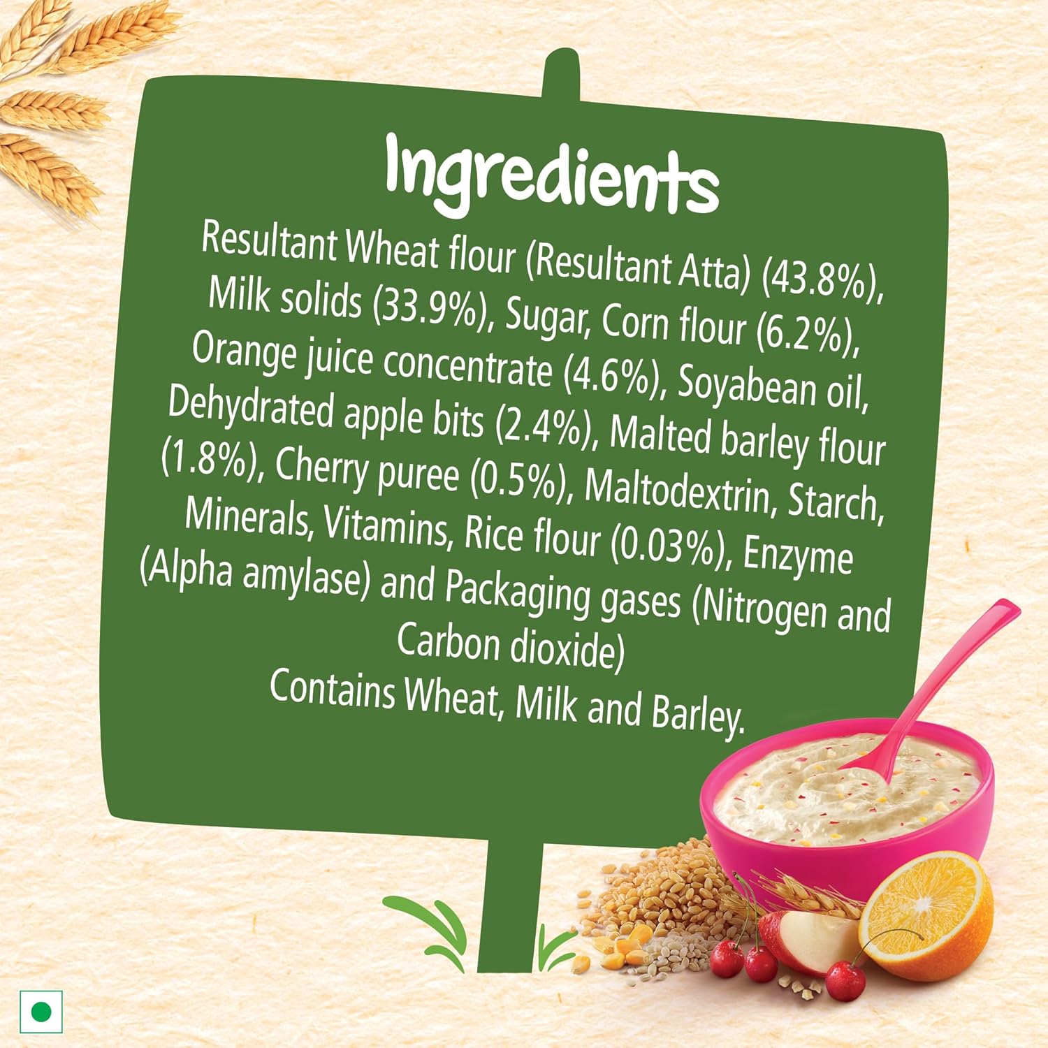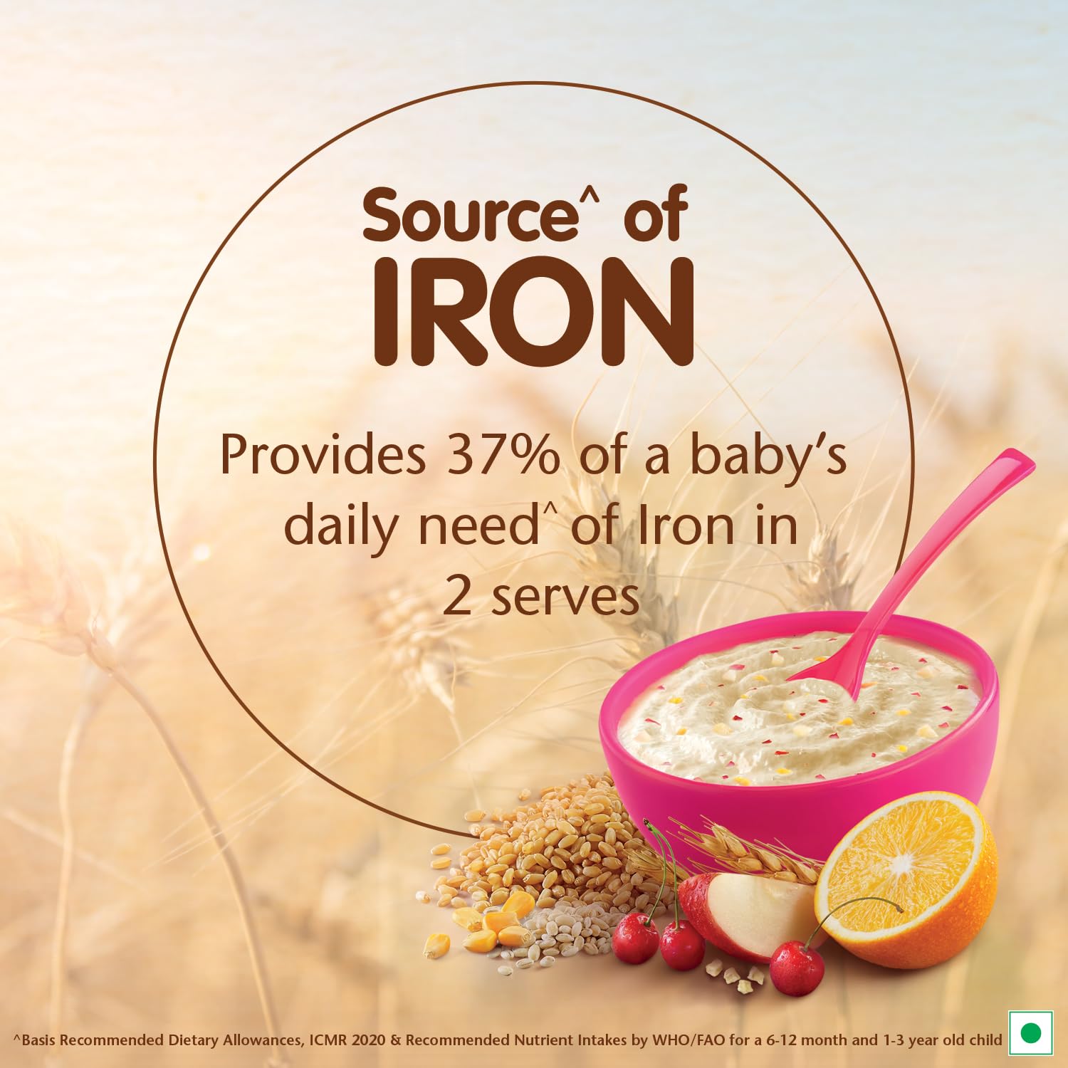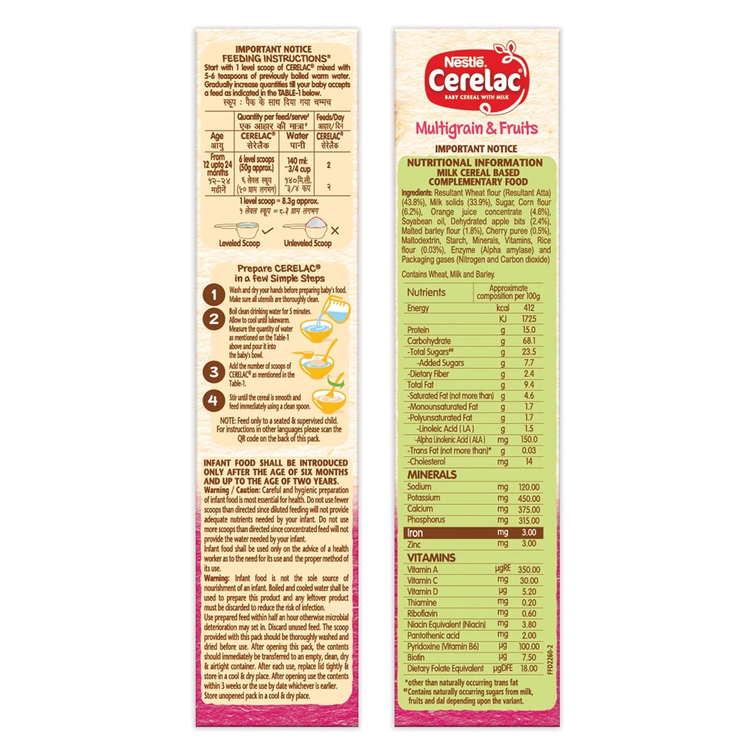 Nestle presents Cerelac Baby Cereal with Milk, Multi-Grain & Fruits complementary food for babies from 12 months onwards. Infants have a higher requirement of nutrients, Cerelac Multi-Grain & Fruits Cereal ensures your growing infant is getting the right nutritional requirements. It is not a breast milk substitute. It is a source of various nutrients including vitamins and minerals. So go ahead and buy this product online today! Important Notice: Mother's Milk is best for your baby.
