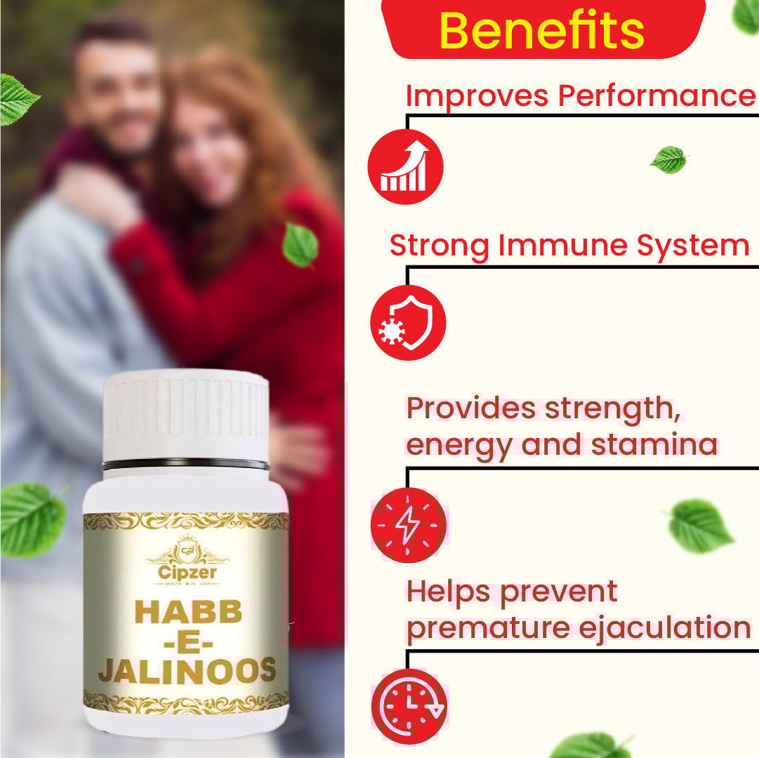 Cipzer Habbe Jalinoos helps to improve physical power in males and is highly beneficial in general debility. This medicine is a nice tonic for the brain and heart too. It gives strength to the body, reduces stress, aids in sexual disorders, enhances fertility, increases sperm count, and regularises the sensory gland.
