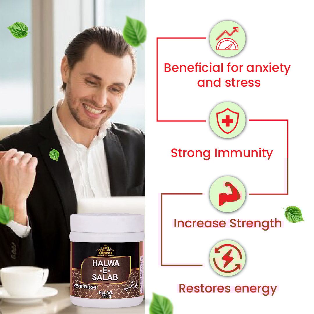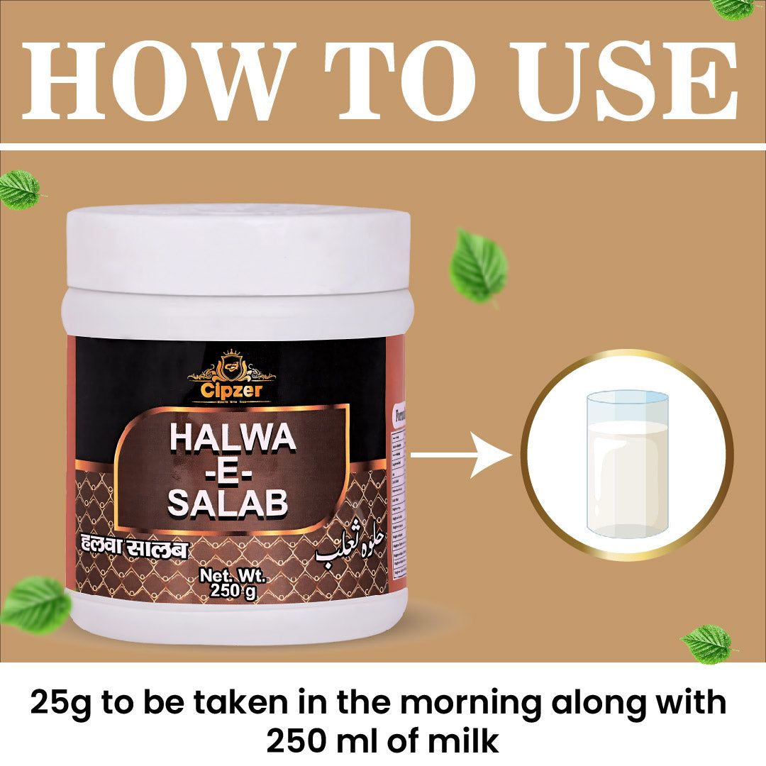 Cipzer Halwa-E-Salab acts as an Aphrodisiac. It helps to increase semen formation, improves the body's general debility, and makes the system refresh. It may restore energy and improve men's vitality, physical strength, and stamina.