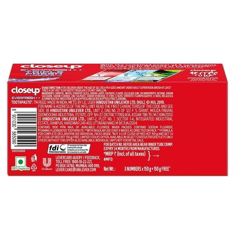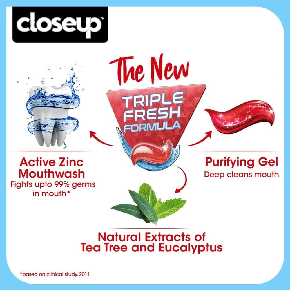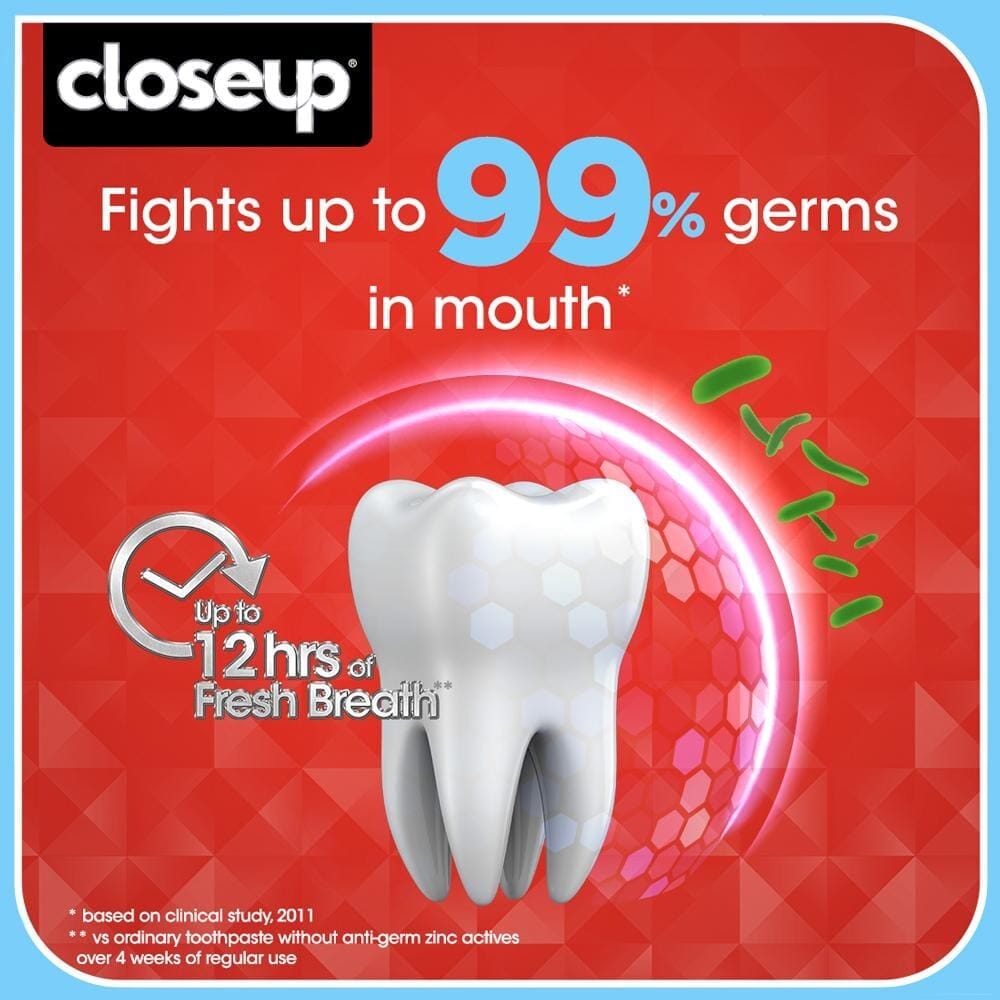 Closeup Ever Fresh Red Hot Gel is the toothpaste for you. Its unique Active Zinc Mouthwash not only cleans deep corners of your mouth of residual germs it also gives you upto 12 Hours Fresh Breath. It helps your teeth stay strong and healthy thanks to the fluoride in it and its microshine crystals help reduce the yellowing of your teeth. Upto 12 hours of lasting fresh breath is based on in-vivo study with regular use over 4 weeks. Kill the bacteria that cause bad breath with Closeup Ever Fresh Red Hot Gel toothpaste.