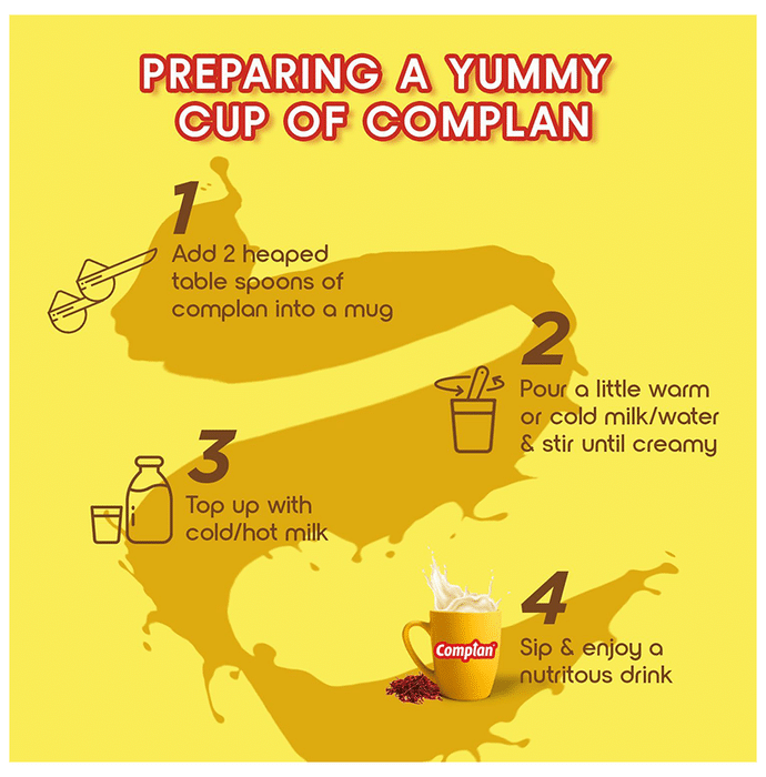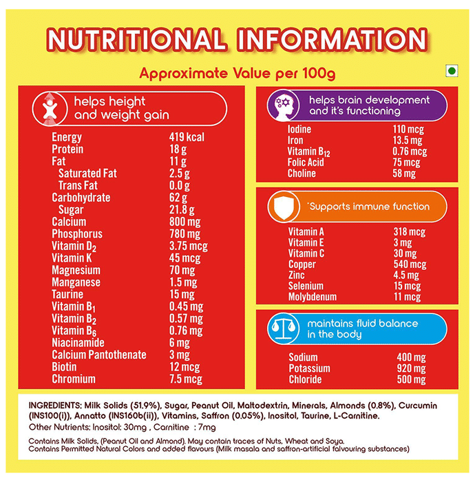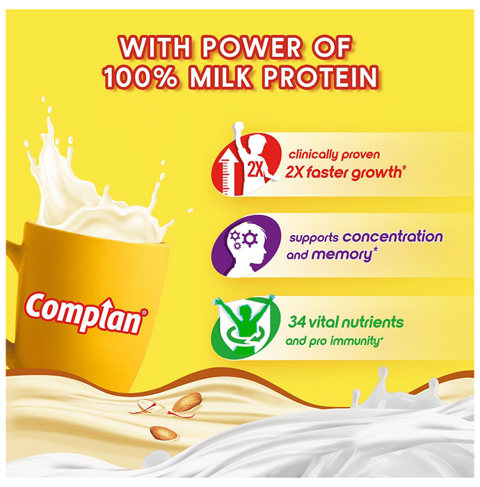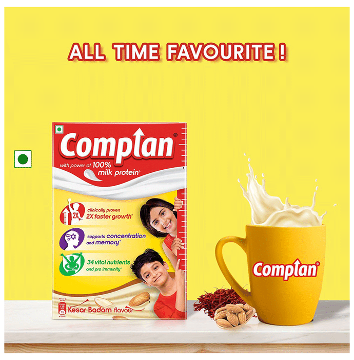 Complan Nutrition and Health Drink Kesar Badam is a specially formulated health drink designed to promote 2x faster growth in children and support their memory and concentration. With a blend of 34 vital nutrients, including 100% milk protein, Complan is a great option to make delicious and nutritious shakes for kids. It contains essential minerals like iron, iodine, and vitamin B12 for brain development, as well as vitamins A, E, and C to support immunity. By incorporating Complan into your child's daily balanced diet, you can help them grow faster and enhance their cognitive abilities. Follow the directions on the pack to prepare a tasty and nutritious drink for your child. Remember to store Complan in a cool, dry place and keep it out of reach of children.