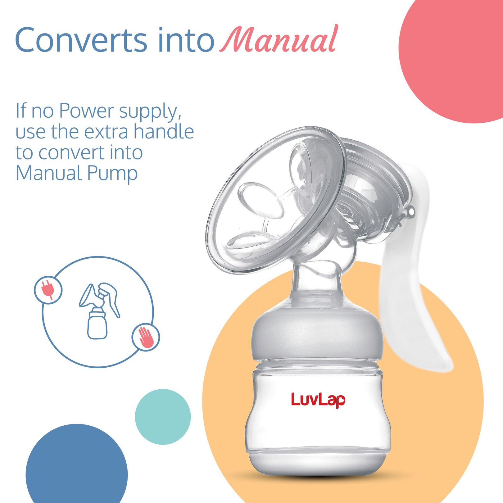 LuvLap Electric Breast Pump is designed to mimic a baby's natural breastfeeding rhythm, making expression a pleasant experience for the mother. The soft silicone massage cushion along with 3 pumping stages of massage-stimulation-expression help to give a natural-like experience. Each mode has 9 intensity levels, and the Smart Memory function remembers the last used setting. The Pump also has a manual mode conversion handle in case you run out of power and need to pump manually.