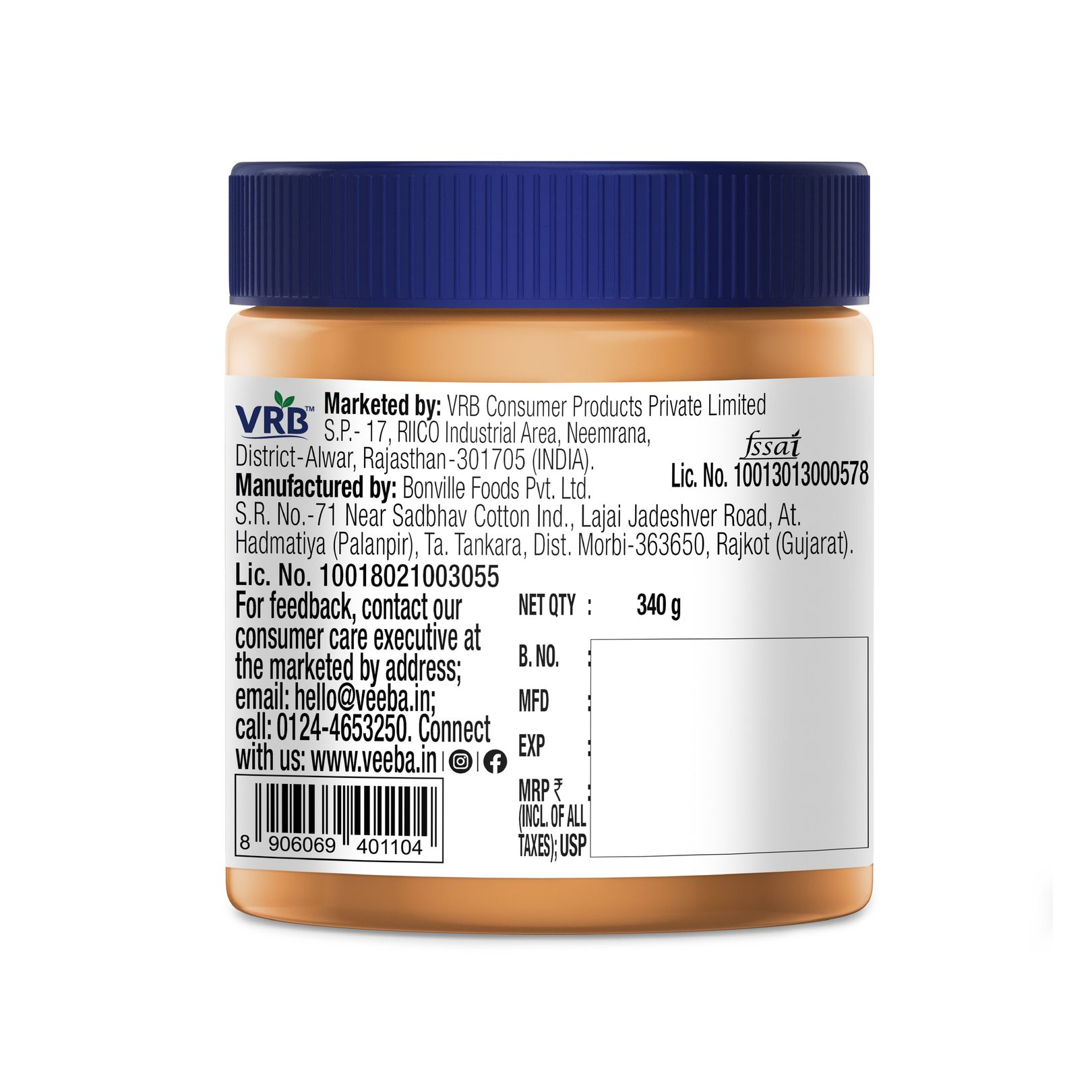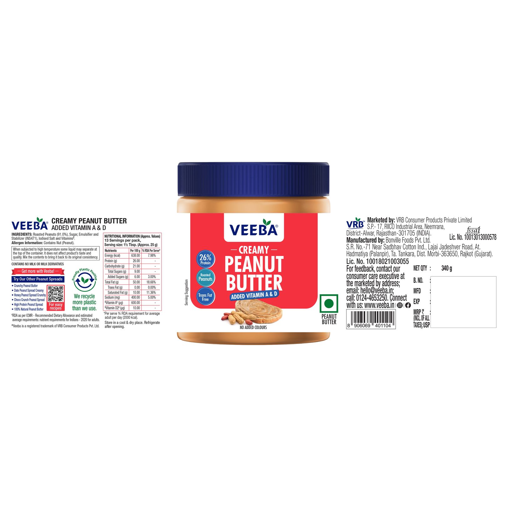 Veeba Creamy Peanut Butter with Vitamin A & D has 26% protein content to boost your daily protein intake in a tasty way. Great peanut butter for children's tiffins and snacks.AA