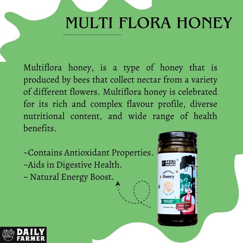 Daily Farmer Multi Flora Honey is a premium, 100% raw and natural honey, carefully sourced from diverse floral regions. It is unprocessed, un-pasteurized, and retains all its natural enzymes, antioxidants, and nutrients, making it a powerful immunity booster. With its smooth texture and rich taste, it serves as a perfect natural sweetener and health enhancer.