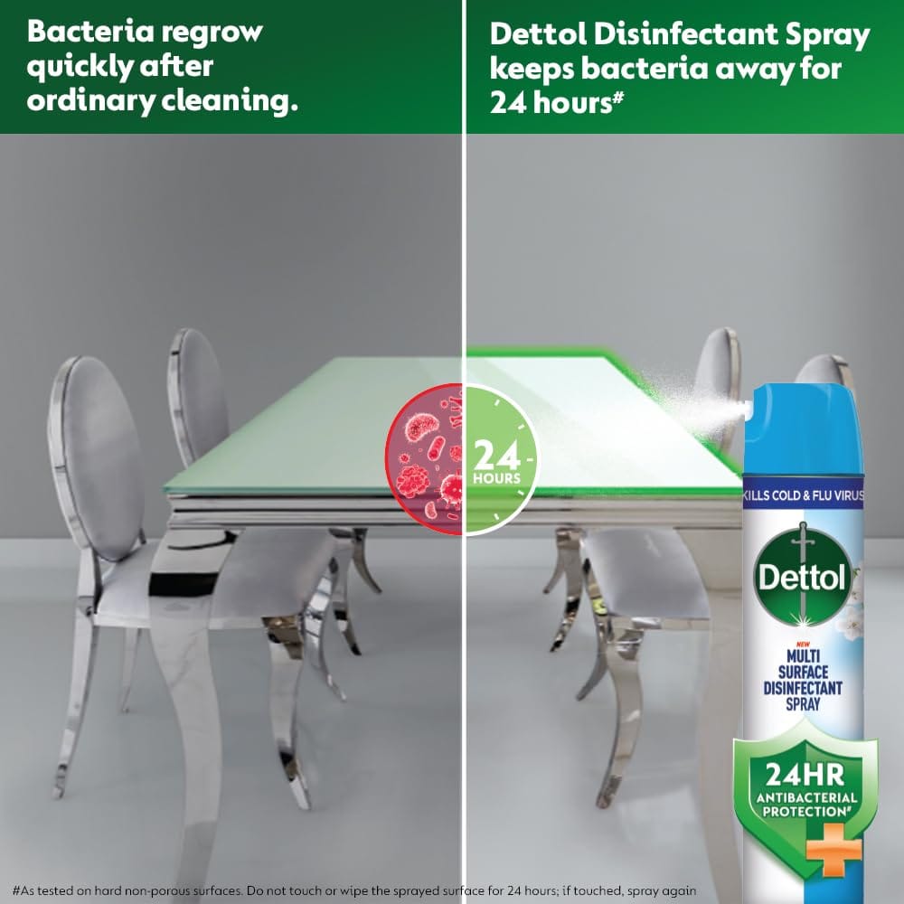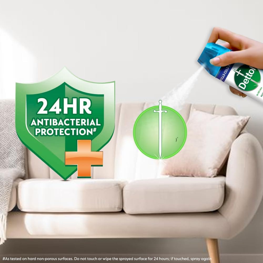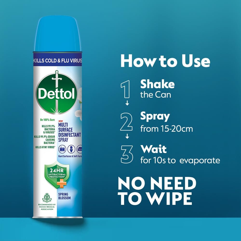 The Dettol disinfectant spray protects you and your family from 100 illness-causing germs, bacteria, and viruses. This alcohol (denatured) surface disinfectant spray sanitizes your home and eliminates odor-causing bacteria. It helps in killing cold and flu viruses, including the h1n1 virus. Dettol disinfectant spray can be used in toilet areas, dustbins, kitchen sinks, shower bases, taps, sofas, curtains, carpets, car seats, etc., Leaving everything clean and fresh. It safely kills germs on everyday items and leaves a pleasant pine fragrance behind. The Indian Medical Association recommends this multipurpose disinfectant cleaner for the home. Usage: Shake dettol disinfectant spray well. Hold spray 15-20 cm from the pre-cleaned surface and spray the surface until covered with mist. Allow to air dry, no need to wipe. Do not use it on polished wood, painted surfaces, or acrylic plastics. For external use only.