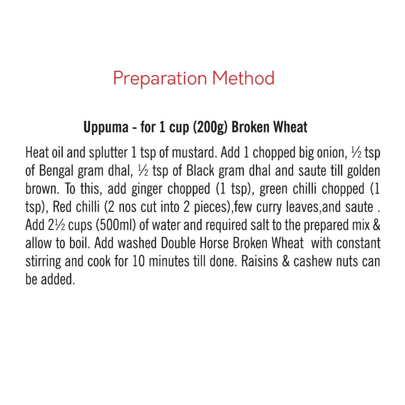 Use Double Horse Broken Wheat to prepare nutritious breakfast dishes like upma or porridge. It can also be added to salads or soups for added texture and nutrition.
