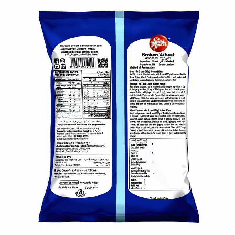 Double Horse Broken Wheat is a high-quality, nutritious product made from carefully selected wheat grains. It is perfect for making wholesome and healthy meals such as upma, porridge, and salads. Rich in fiber and essential nutrients, this 500g pack offers convenience and health benefits for your daily diet.