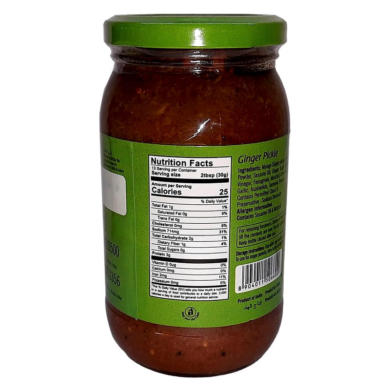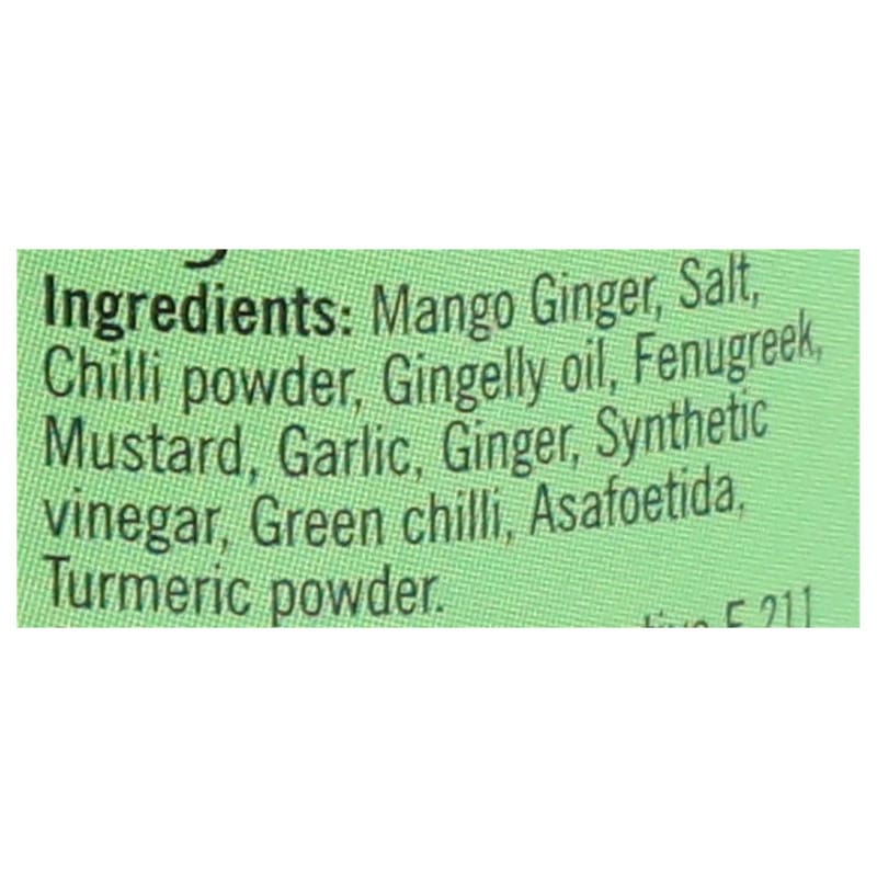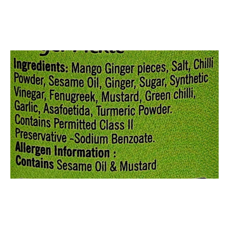 Ginger (primary), edible vegetable oil, mustard seeds, fenugreek, red chilli, salt, vinegar, turmeric, spice mix, permitted preservatives.