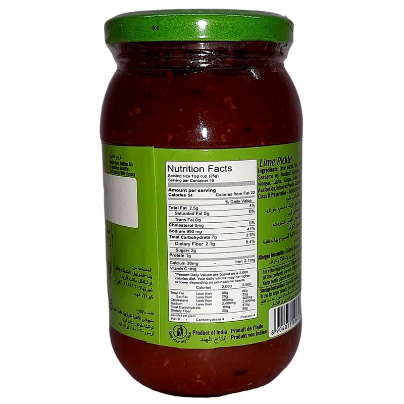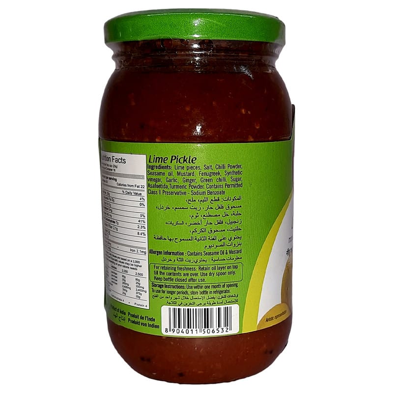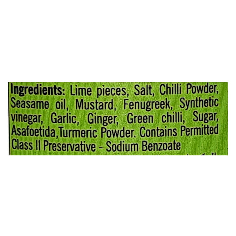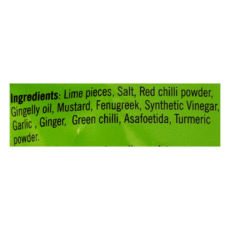Typical ingredients: Limes, edible vegetable oil, salt, red chilli, mustard, fenugreek, turmeric, asafoetida, spices, and permitted preservatives. See product label for full ingredient list and allergen information.