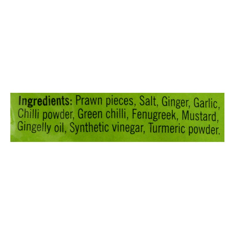 Prawns, mustard oil, vinegar, salt, red chilli powder, mustard seeds, fenugreek seeds, turmeric, asafoetida (hing), curry leaves, citric acid, natural spices.