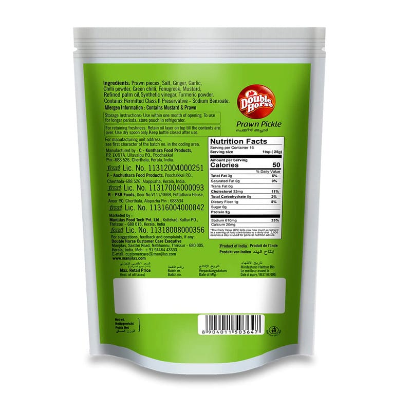 Double Horse Prawn Pickle is a gourmet coastal-style pickle made from premium prawns, carefully marinated in a balanced blend of traditional spices, tangy vinegar and mustard oil. Perfectly crafted to deliver a burst of umami and heat, this pickle pairs beautifully with rice, rotis, dosas, sandwiches and as a flavour booster for curries and salads.