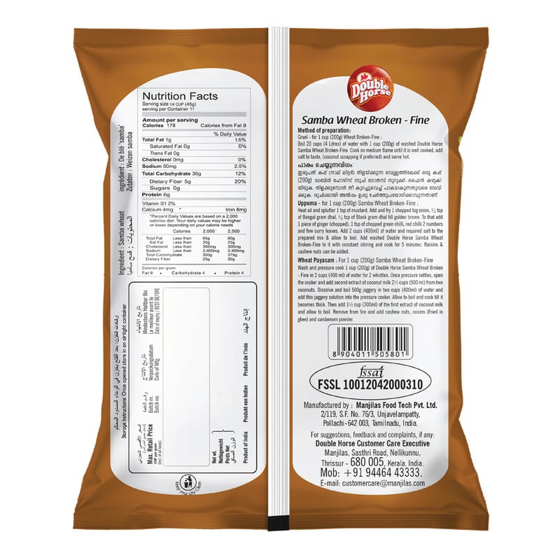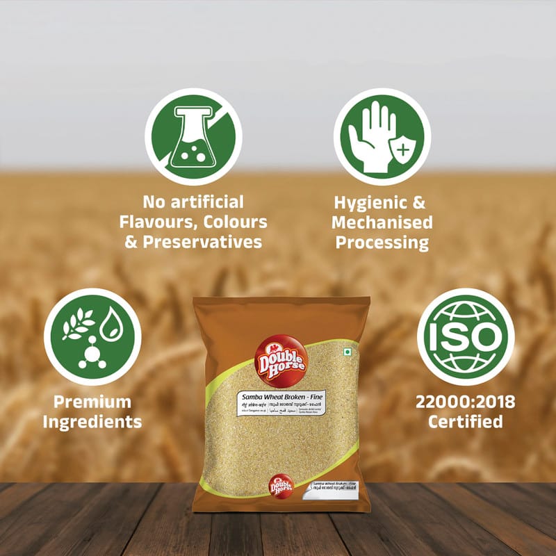 Double Horse Samba Wheat Broken Fine delivers the earthy taste and wholesome texture of broken wheat with a fine grind that cooks quickly and blends beautifully into both sweet and savory recipes. It s a great pantry staple for nutritious breakfasts and comfort meals.