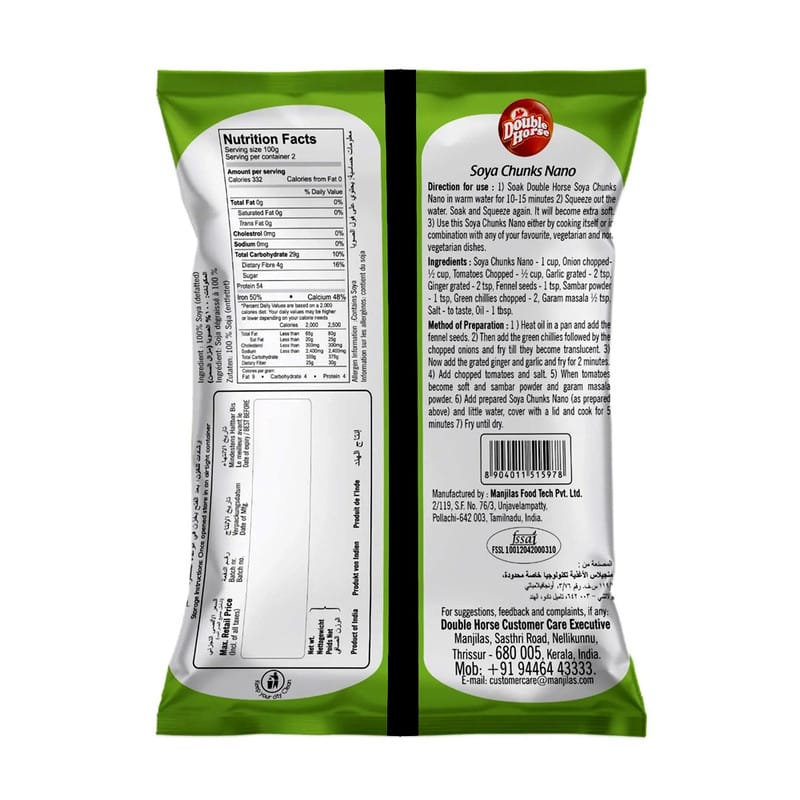 Double Horse Soya Chunks Nano are bite-sized textured soy protein pieces designed for fast hydration and even flavour absorption. Made from high-quality defatted soy, they provide a convenient, plant-based source of protein and are ideal for curries, stir-fries, soups, salads and wraps.