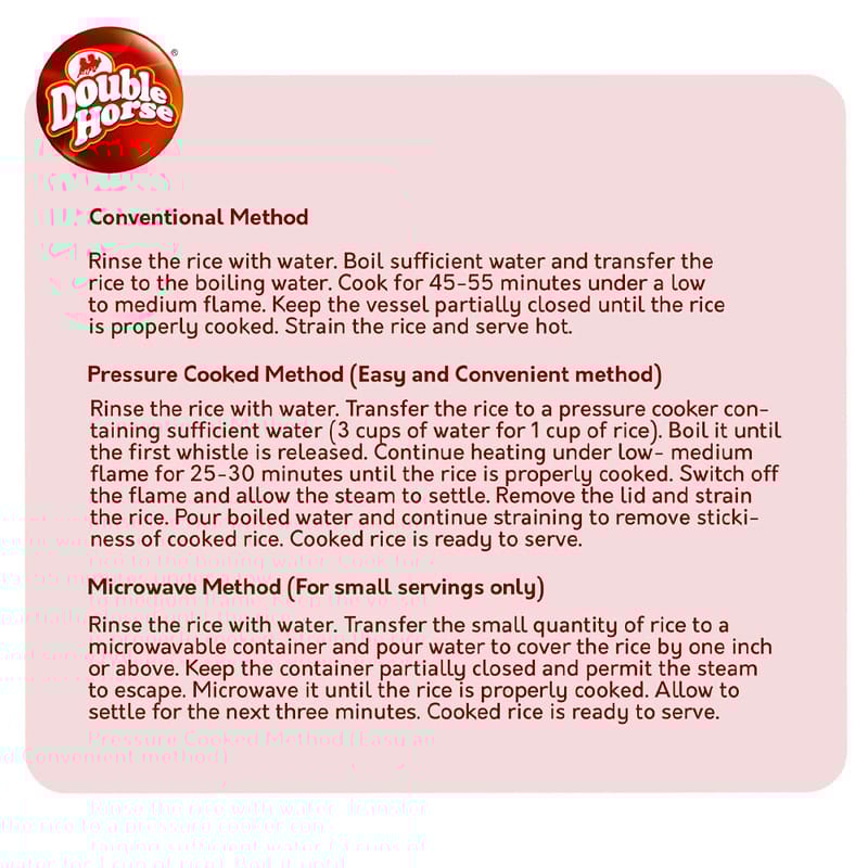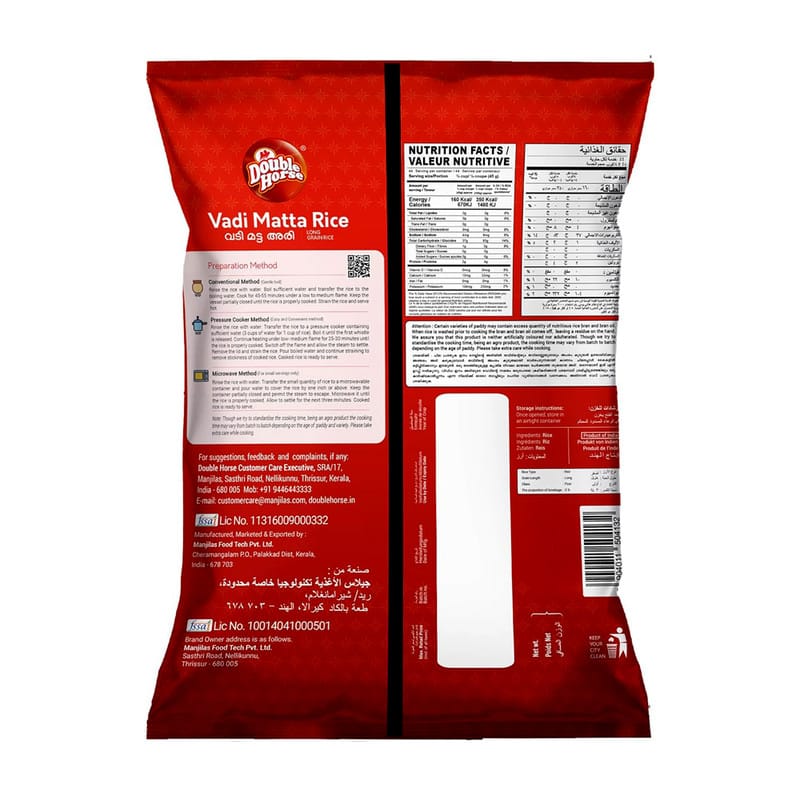 Double Horse Vadi Matta Rice is a premium parboiled red matta rice prized for its strong aroma, firm bite and naturally nutty flavor. Carefully processed to retain more bran nutrients, this rice delivers hearty texture and deep color perfect for everyday meals, traditional recipes and healthier alternatives to polished white rice.