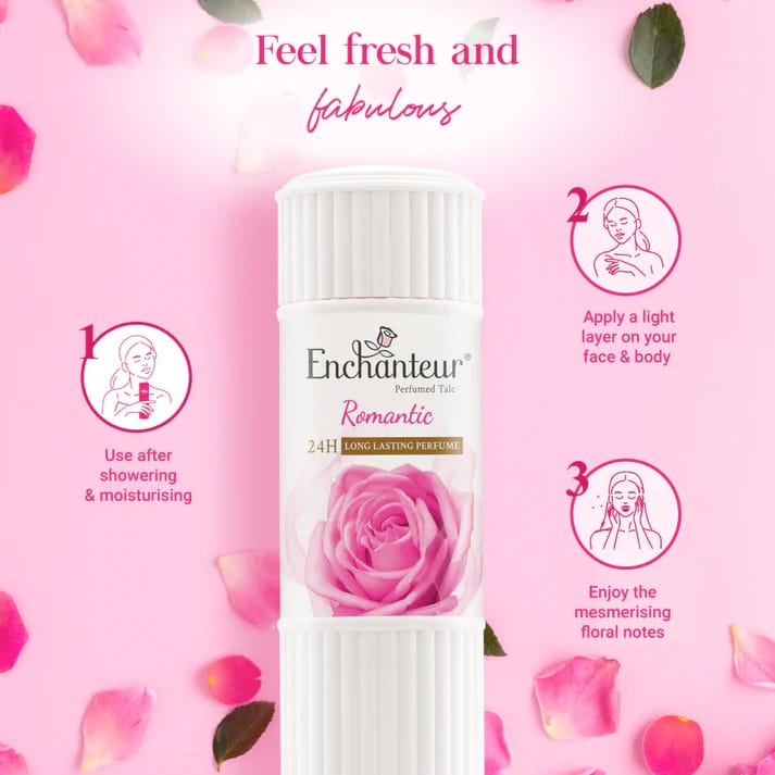 Enchanteur Perfumed Talc Powder is designed to leave your skin feeling soft and delicately fragranced. This luxurious talcum powder helps keep your skin fresh, smooth, and irresistibly perfumed with a long-lasting floral scent that lingers all day. Perfect for daily use, it absorbs moisture, providing a silky-smooth finish and enhancing your natural charm.