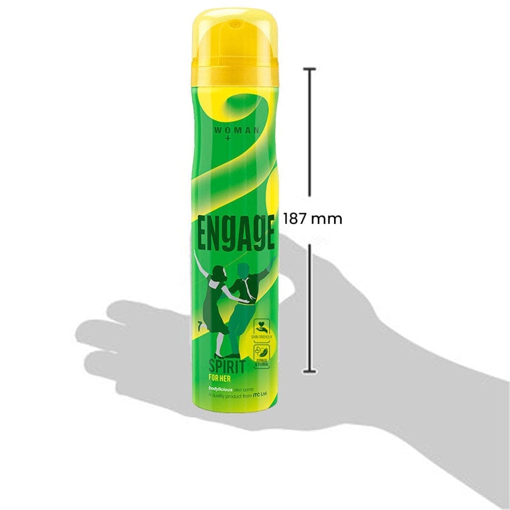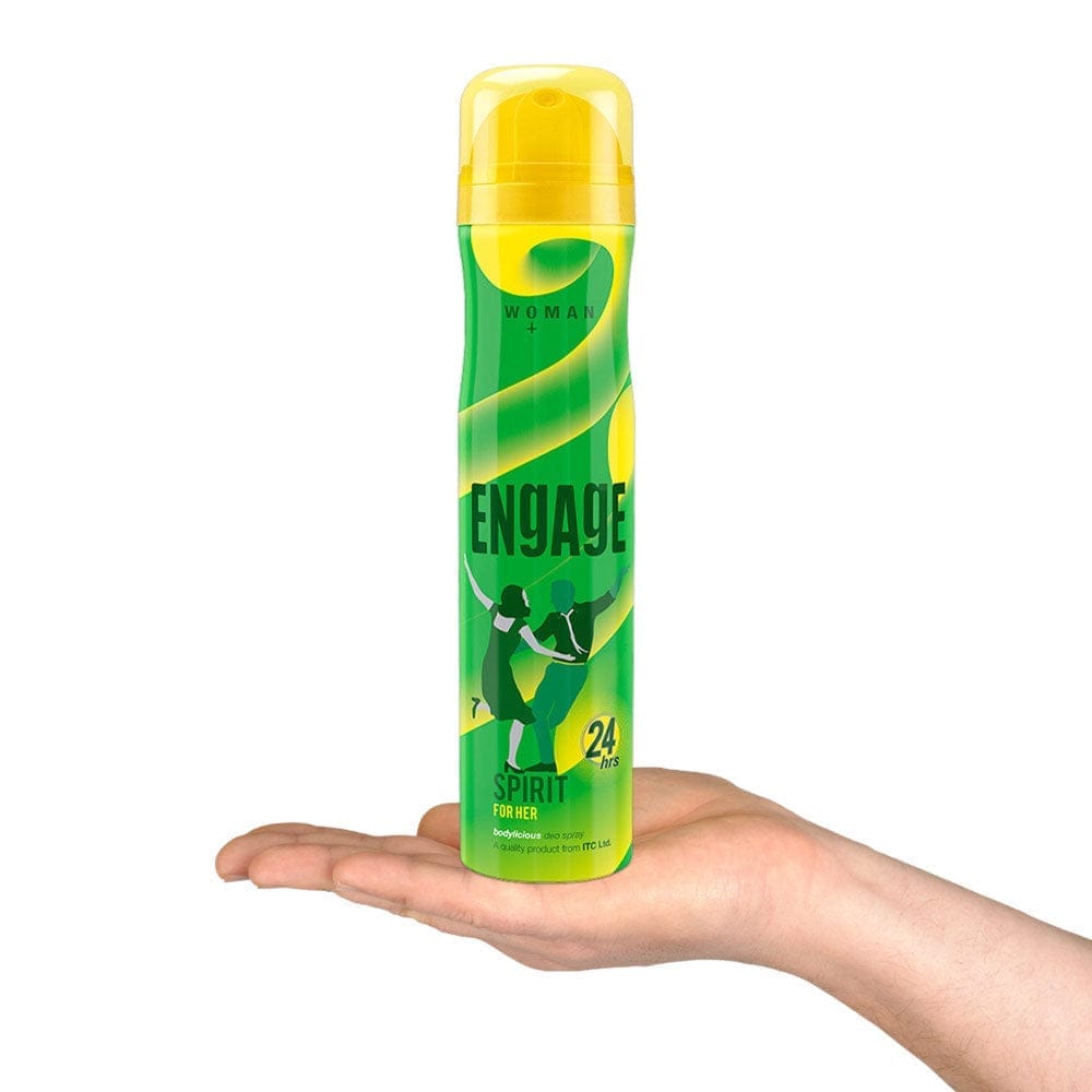 Engage Spirit for Her has a cheerful & jolly fragrances because of its vibrant fruity floral combination. Long lasting freshness. Keeps body odour away Skin Friendly Deodorant Perfect for everyday use How to Use- Hold the can approximately 15cm from your body or clothes while spraying How to Use - Hold the can approximately 15cm from your body or clothes while spraying
