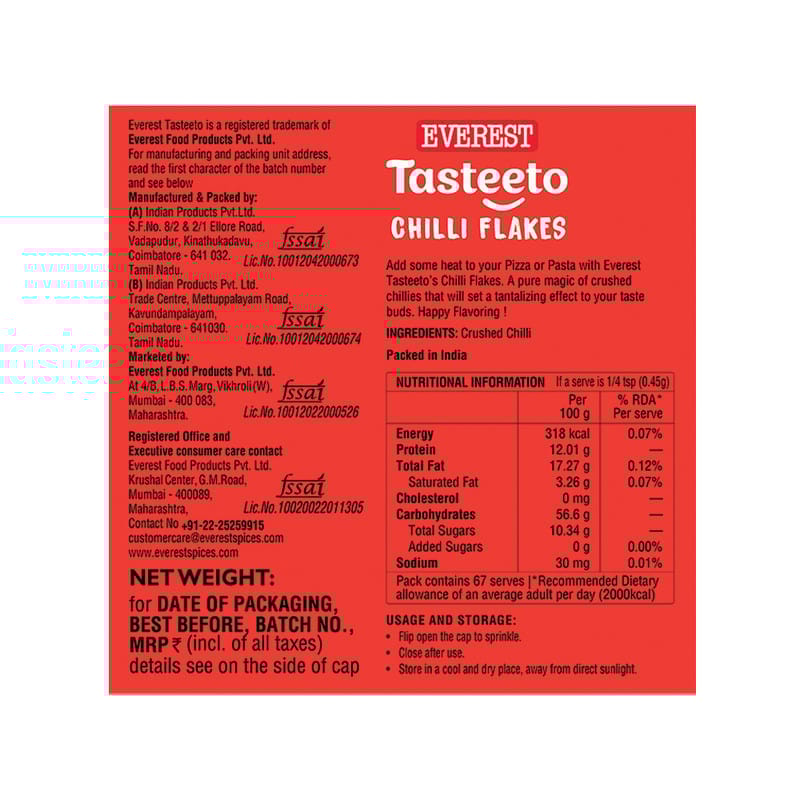 Description: Elevate your meals with the bold and spicy kick of Everest Tasteeto Chilli Flakes. Made from high-quality red chilies, these flakes are finely crushed to bring you the perfect combination of heat and flavor. Ideal for sprinkling on pizzas, pastas, salads, and various other dishes, Everest Tasteeto Chilli Flakes are your go-to spice for adding a burst of flavor to your food.