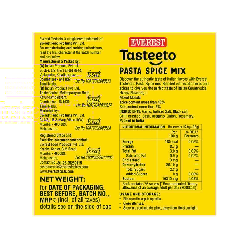 Everest Tasteeto Pasta Spice Mix is a carefully crafted blend of spices that brings the authentic flavor of Italian pasta right to your home. Made with high-quality ingredients, this 38g pack is perfect for creating a variety of pasta dishes with ease.