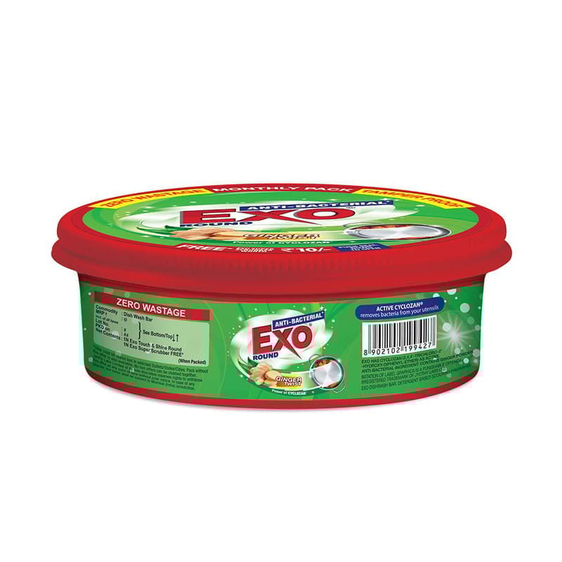 Exo Round Ginger Touch and Shine is a powerful and refreshing dishwashing bar designed to cut through tough grease and leave your utensils sparkling clean. Infused with the natural goodness of ginger, it not only cleans effectively but also adds a refreshing fragrance to your kitchen experience.