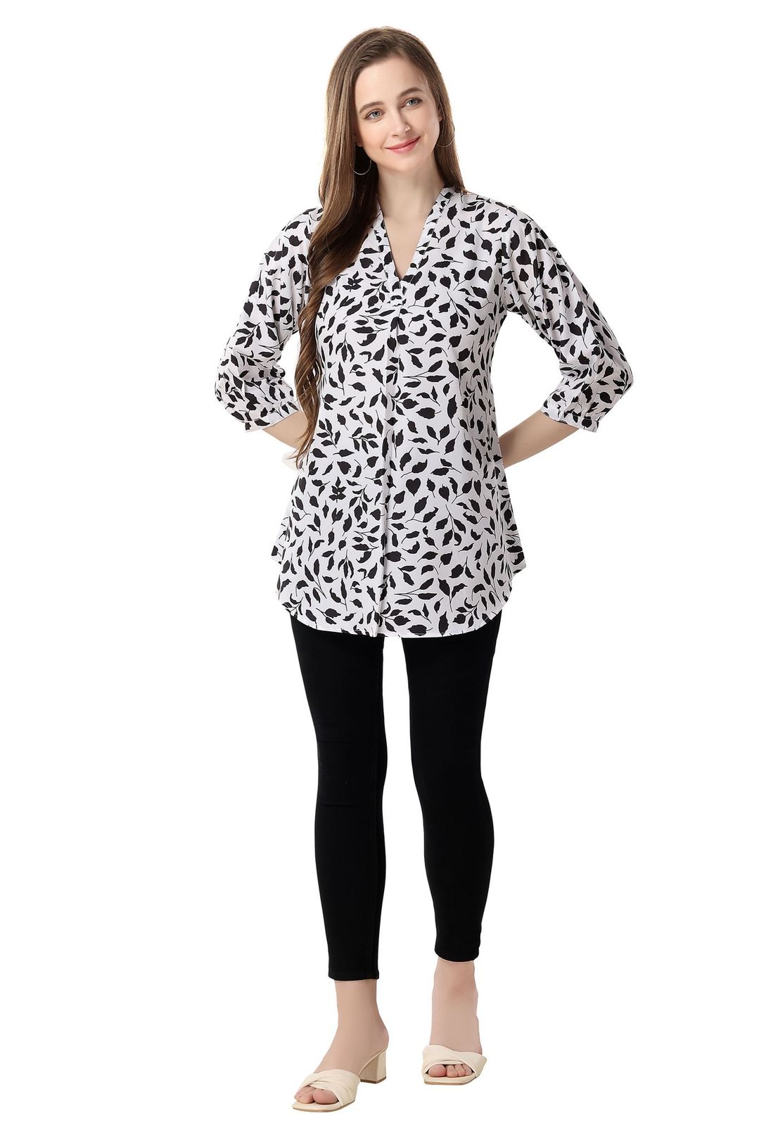 Fashionable Faux Crepe Tunic Featuring a Bold Black and White Print