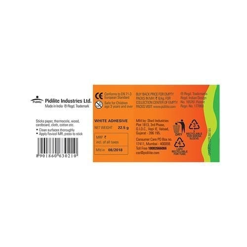 Fevicol Easy Flow Adhesive is a polysynthetic resin adhesive. It is a synthetic white adhesive used to stick paper, cardboard, thermocol, fabrics, etc. It is also used in handicrafts activities like doll making, shell crafts and school projects. It can be utilised in bonding different materials, where one of the surfaces to be bonded has to be porous. Fevicol strongly binds wood, plywood, laminate, veneers, MDF, boards and cork etc. It is also utilised in sports goods manufacturing and bookbinding.