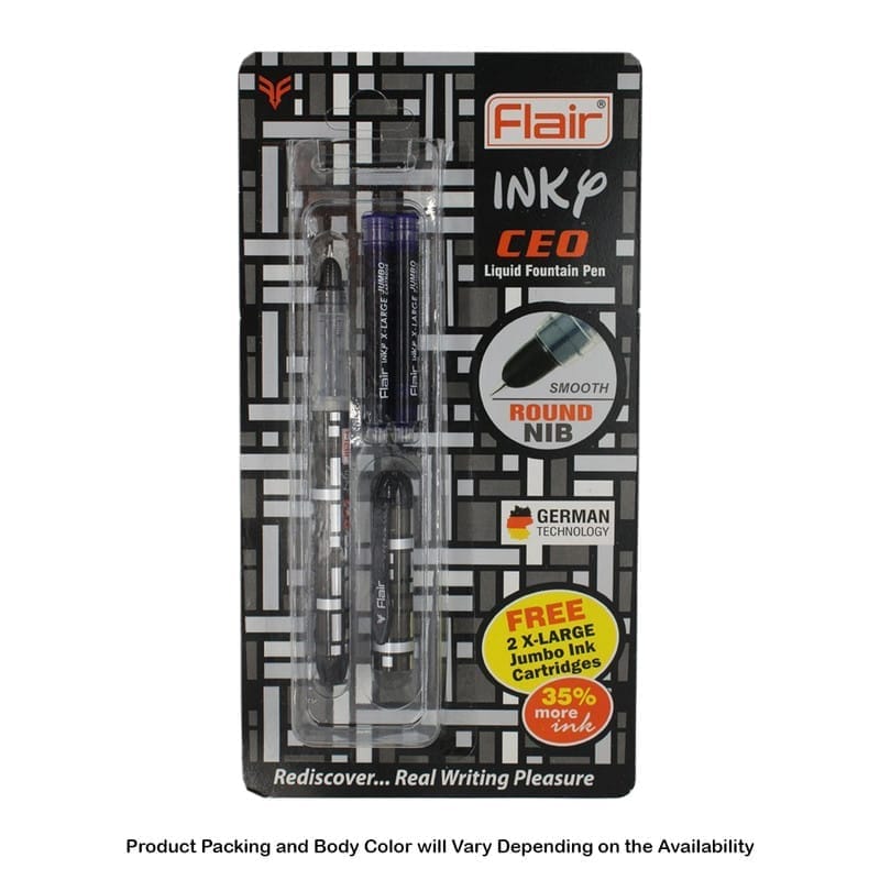 The Flair Inky CEO Fountain Pen features smooth-flowing liquid blue ink, designed for comfortable and elegant writing. It comes with two refill cartridges, ensuring long-lasting use and convenience. The pen is perfect for professionals and students who prefer the classic fountain pen experience with modern ink technology.