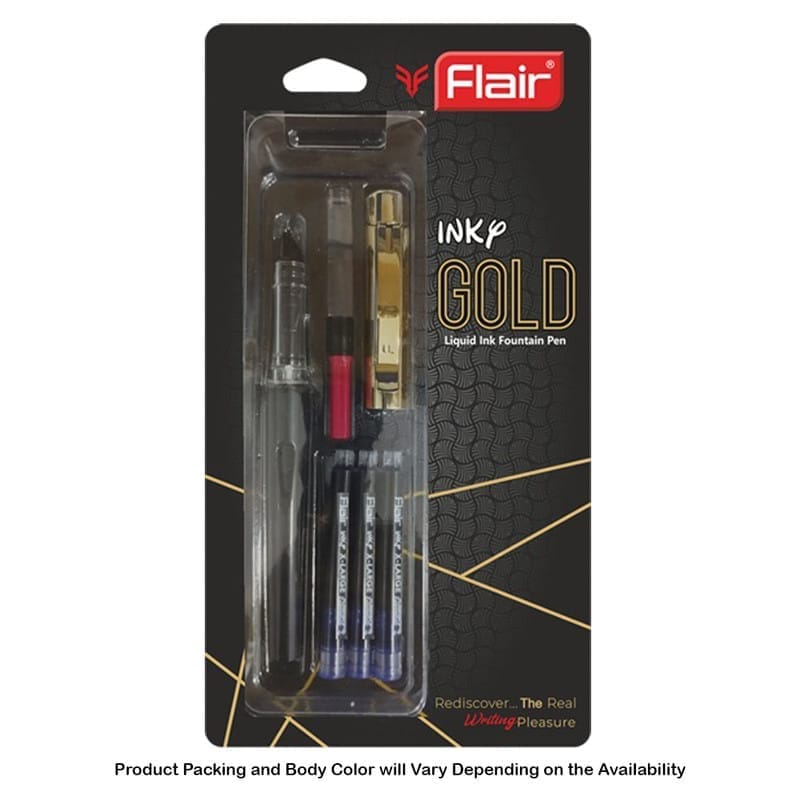 Flair Inky Gold Liquid Ink Fountain Pen, Blue Ink,3 Ink Cartridges, 1 Ink Converter For School, Office, Home