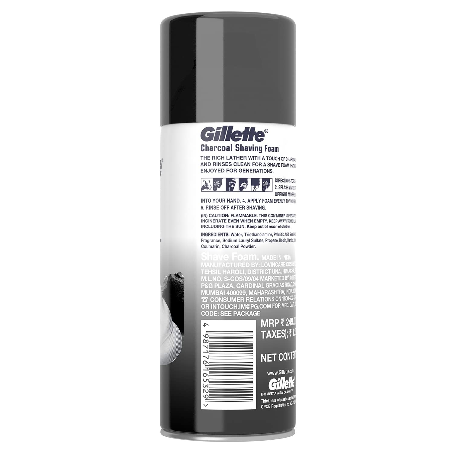 Gillette foam with a touch of charcoal provides enhanced cleansing to remove dirt from the skin during shave