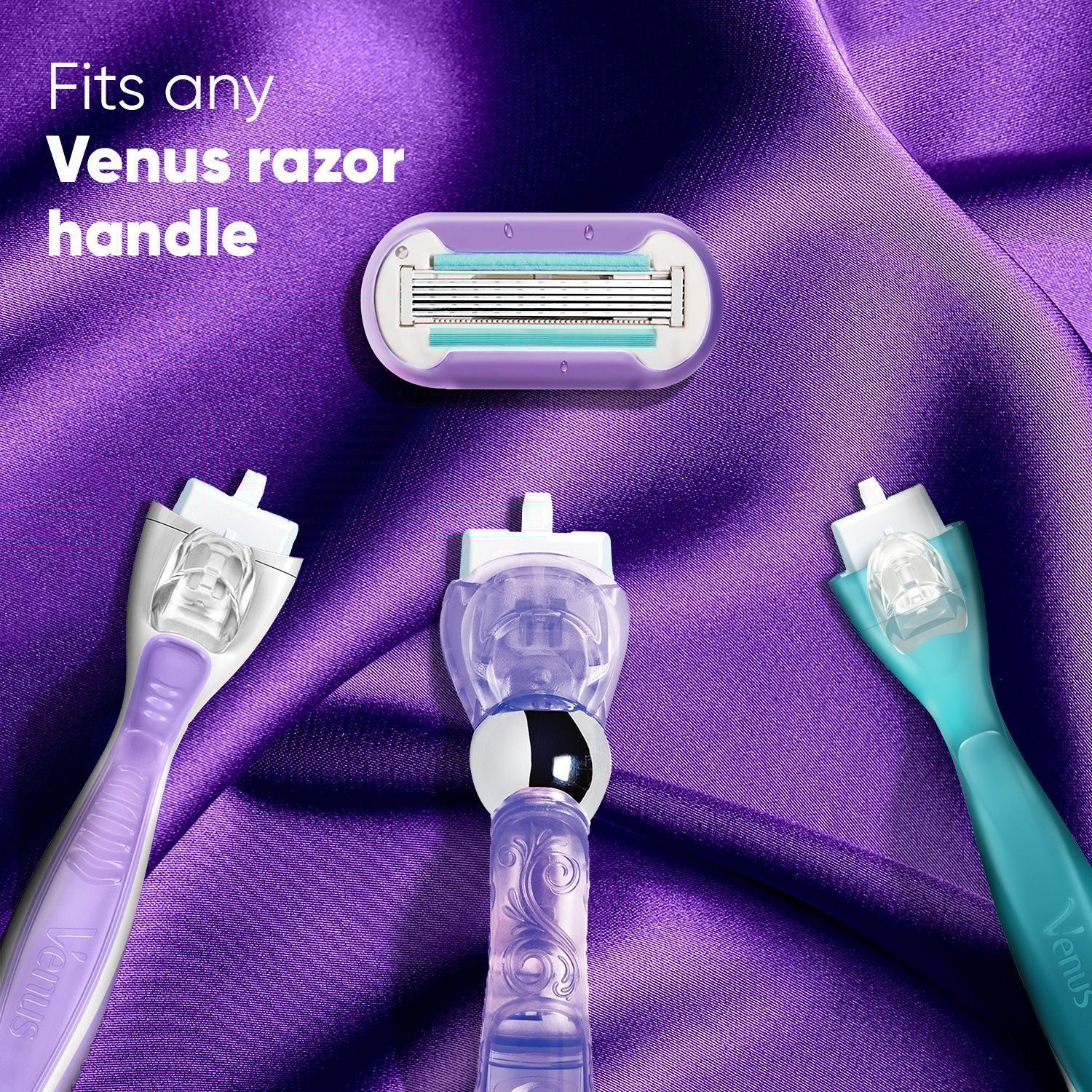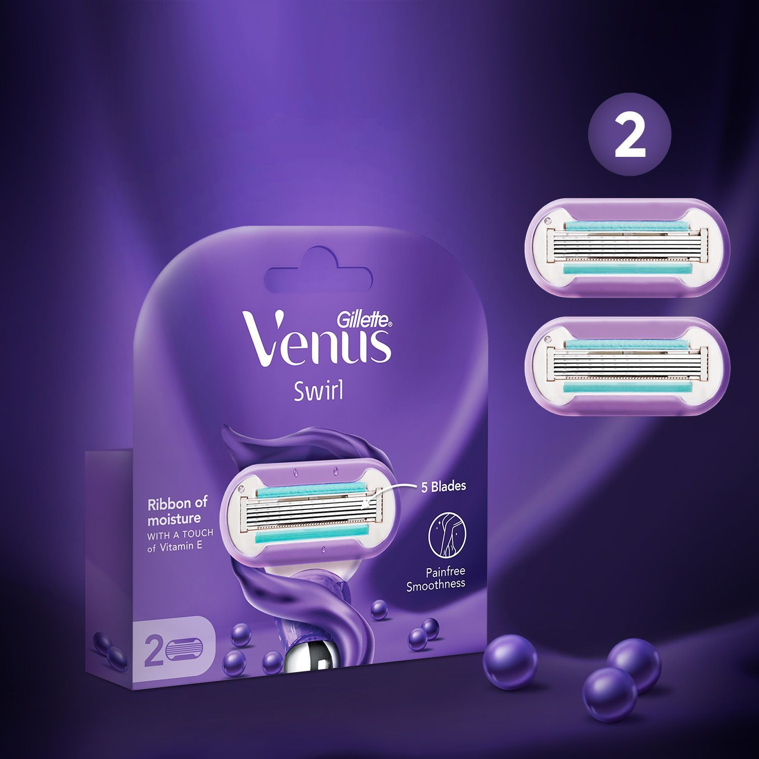 Gillette Venus swirl has 5 extra thin blades spaced closer together for no missed hair and long lasting smoothness. Water activated ribbon of moisture and a glidestrip with vitamin E protects and nourishes the skinPG-VSHR-002