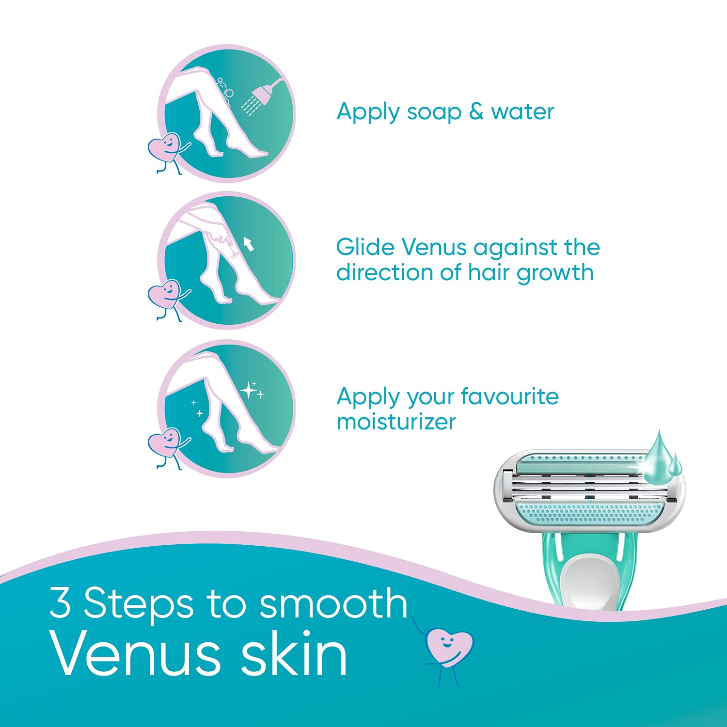 Gillette Venus Skin Love is designed with a special glide-strip containing Skin Essence that hydrates and protects your skin, giving it a super smooth finish after hair removal! It is a pack of 3 use and throw disposable razors with easy to grip scented handle. The dual finger rest and flexible head helps you grip your Venus better as it moves along your curves easily when you?re using it in the shower. Just apply water and soap, glide your Venus against the direction of hair growth and then wash and apply your favorite moisturizer!