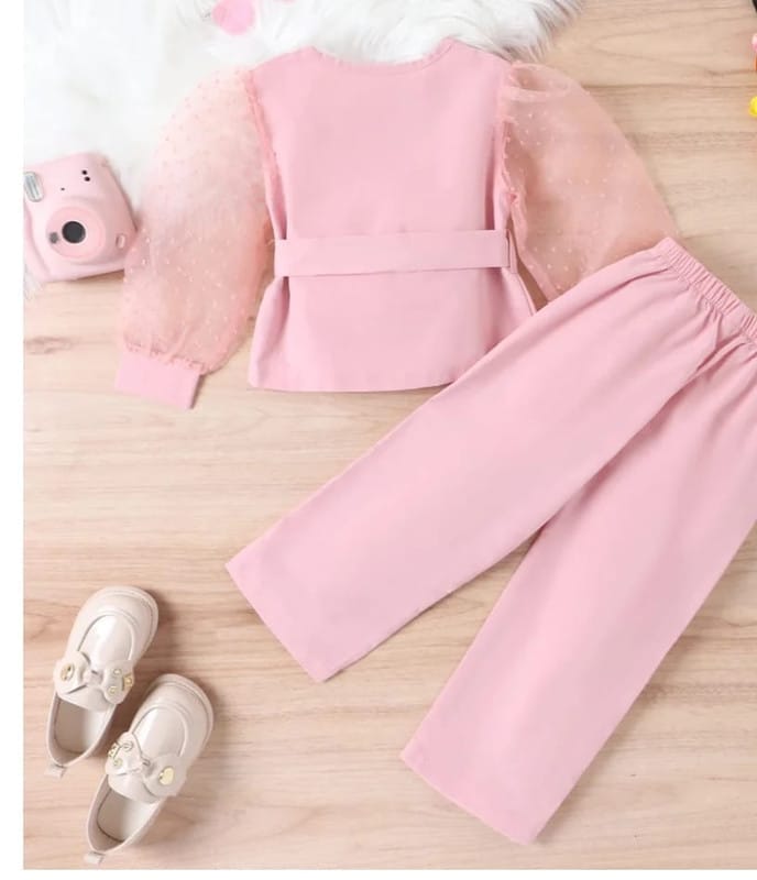 Solid Pink Co-ord Set With Belt, Square Neckline, Transparent Puff Long Sleeves, Square Neckline, Transparent Puff Long Sleeves
