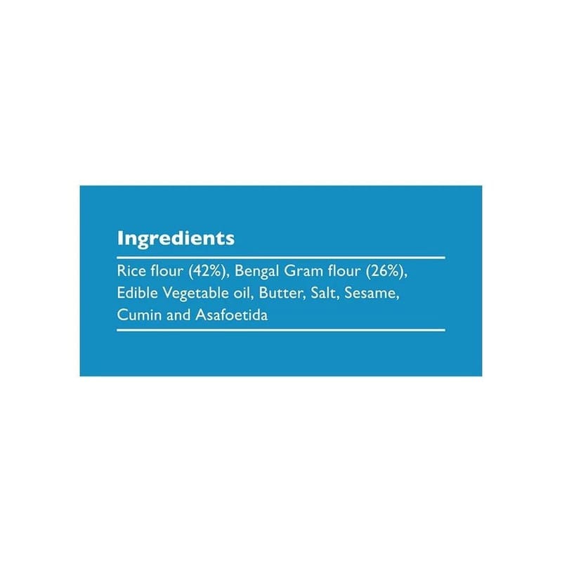 Rice Flour, Butter, Urad Dal Flour, Edible Oil, Salt, and other spices.